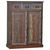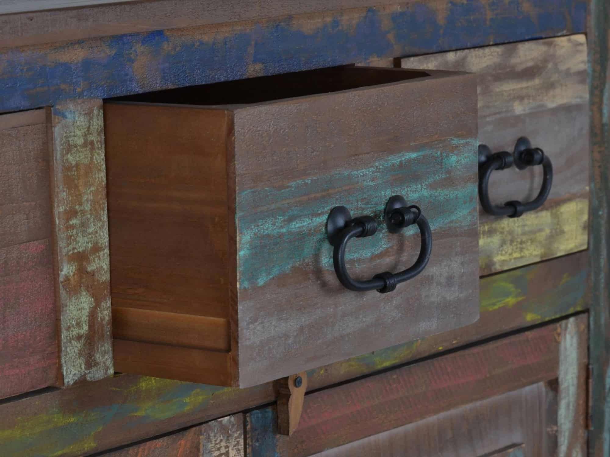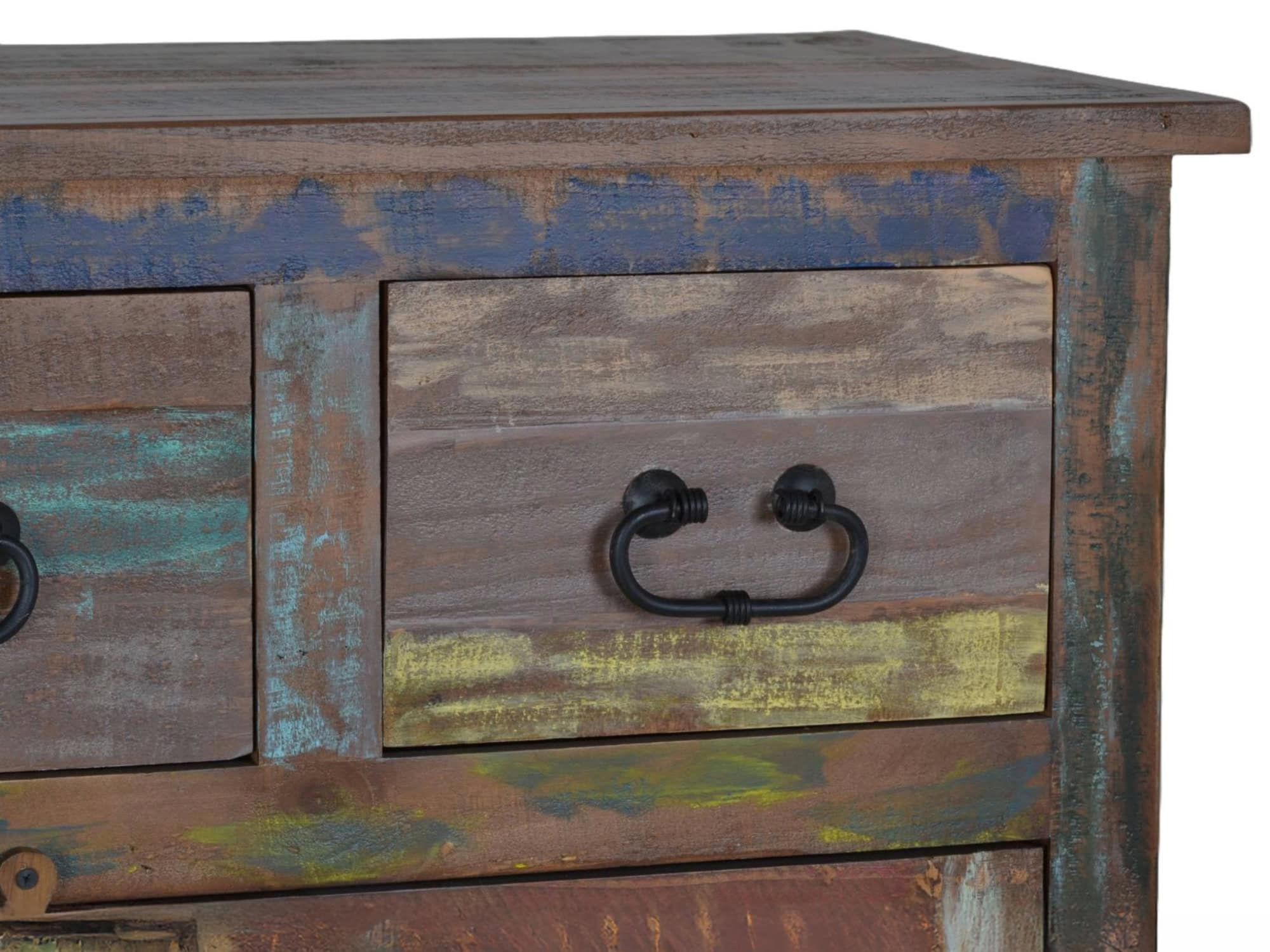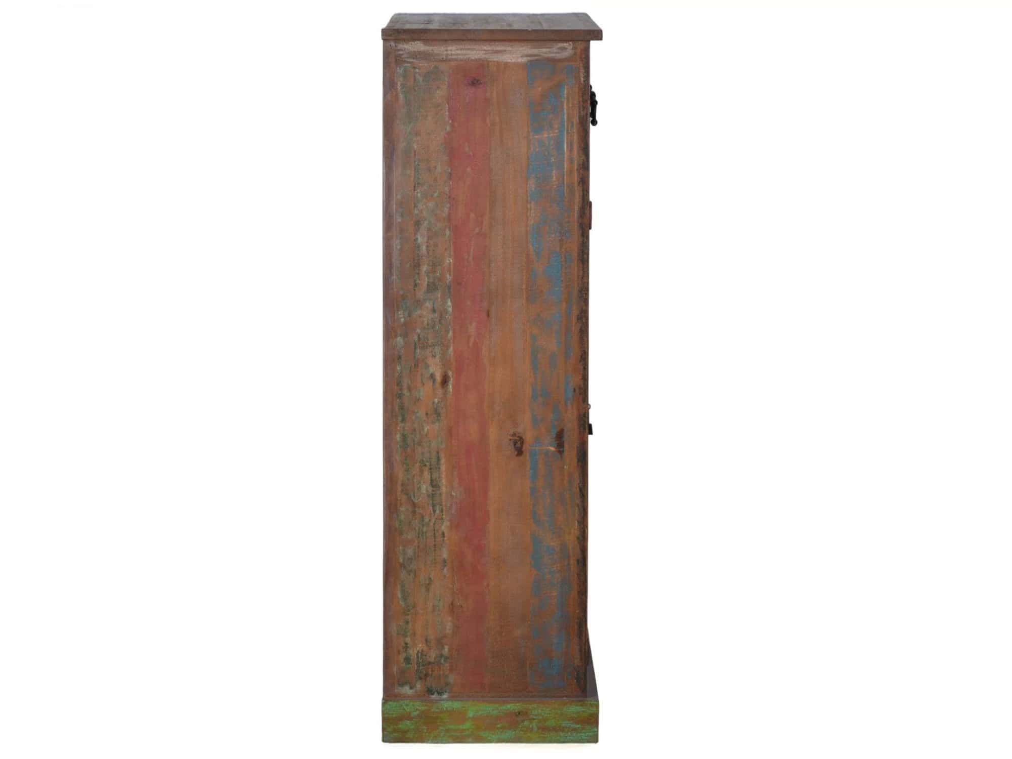 Schuhschrank, Altholz mit Gebrauchsspuren, lackiert, bunt, 3 Schubladen, 2 Türen, 4 feste Böden hinter den Türen.