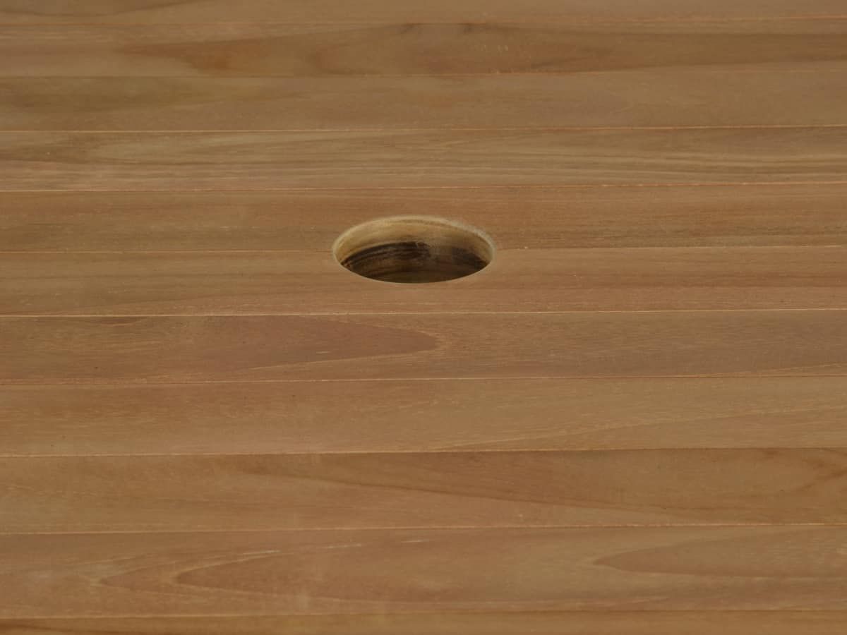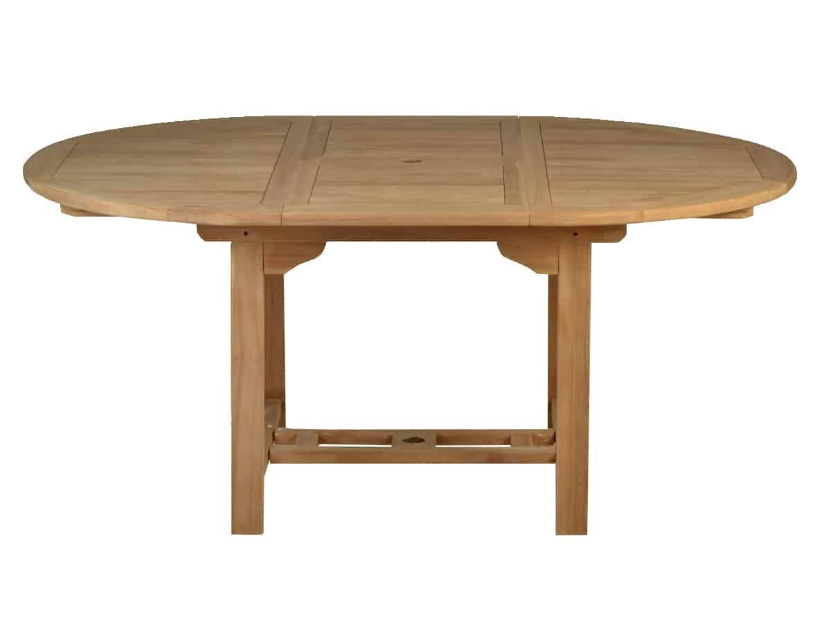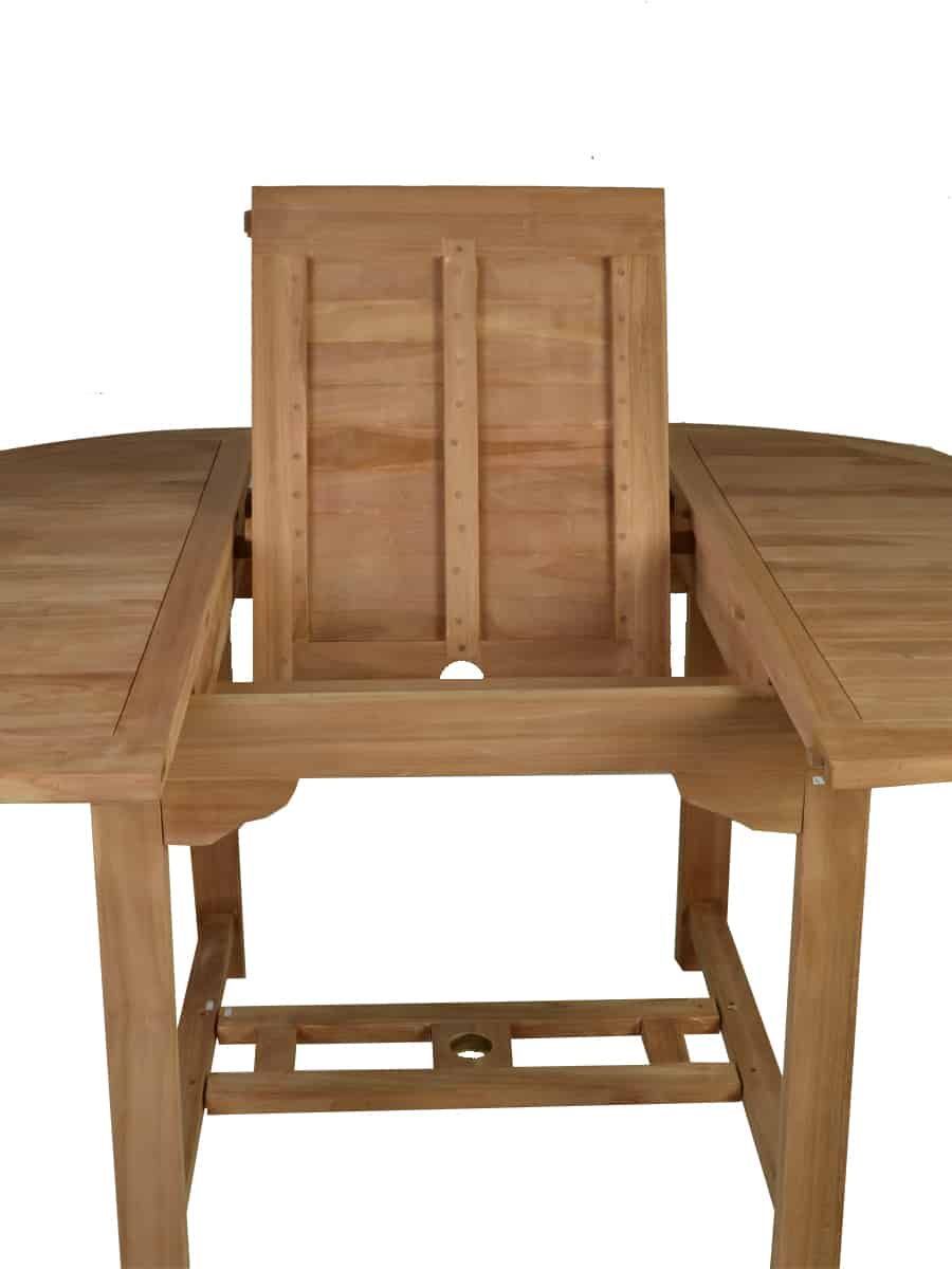 Praktischer ausziehbarer Gartentisch aus Teakholz mit integrierter Sonnenschirmvorrichtung. Für kleinere Terrassen oder Balkone eignen sich variable Gartenmöbel besonders gut. Schön kompakt ist auch dieser runde Teakholztisch. Mit einem Durchmesser von 120 cm bietet er 4 bis 5 Personen ausreichend Platz. Sollte die Runde dann größer werden, lässt er sich ganz schnell per Kulissenauszug auf 170 cm erweitern und schafft so insgesamt 8 Personen Platz. Highlight: