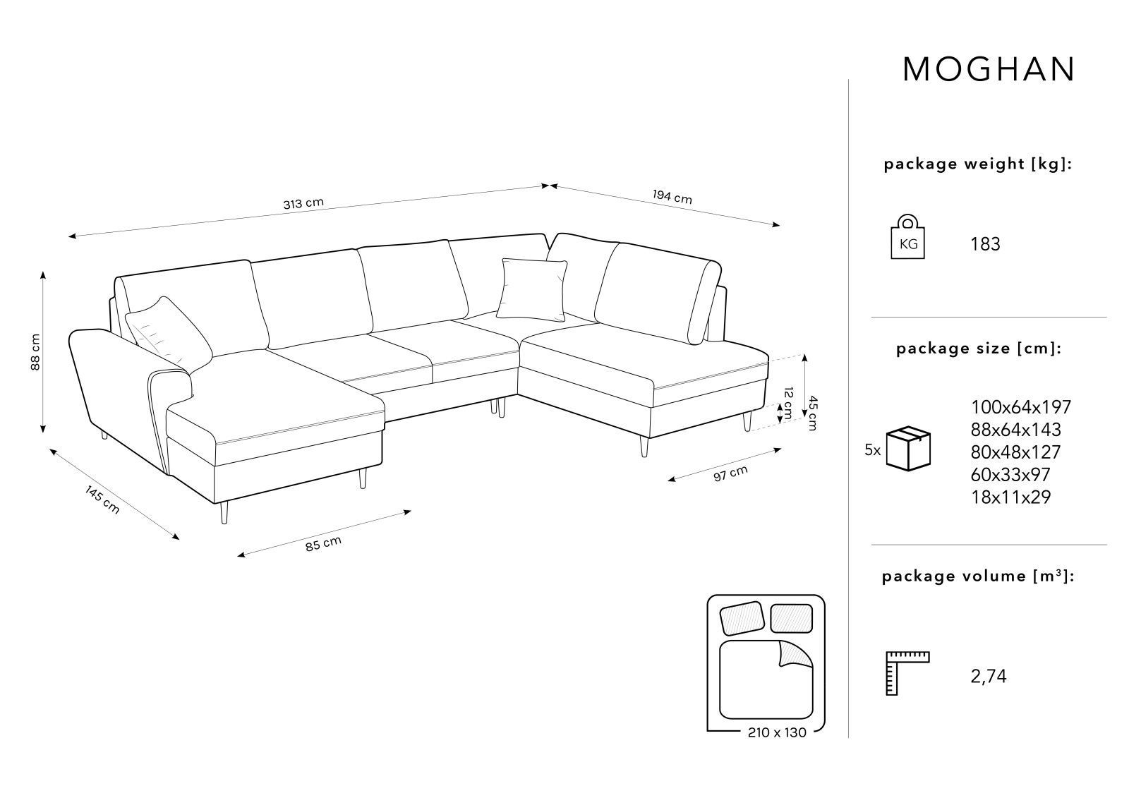Micadoni 7-Sitzer Samtstoff Panorama Sofa Rechts mit Box und Schlaffunktion Mogh...