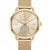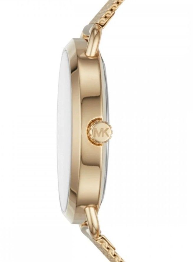 Diese wunderschöne Damenuhr Michael Kors MK3844 Portia besticht durch ein glitzerndes, goldenes Zifferblatt. Das Zifferblatt ist mit goldenen Stabindexen und schlanken goldenen Zeigern versehen. Die Uhr ist aus goldfarbenem PVD-Edelstahl gefertigt und wird mit einem attraktiven Metallarmband aus Mes