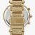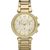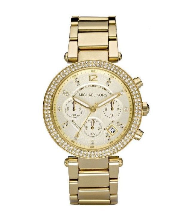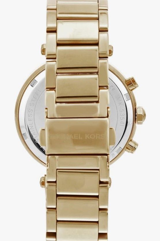 Damenuhr Michael Kors MK5354 mit hochglänzender PVD-Vergoldung, im Mittelpunkt ein atemberaubendes champagnerfarbenes Multi-Zifferblatt mit Chronograph, Datumsanzeige und funkelnden Stundenmarkierungen. Die Uhr wird mit einem Druckknopfverschluss an einem goldfarbenen Metallarmband befestigt und ver