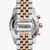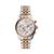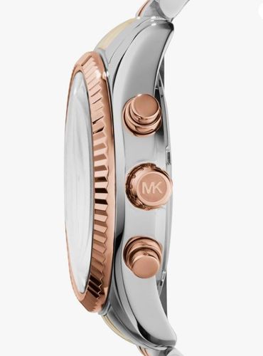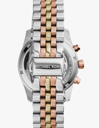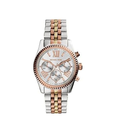 Die Michael Kors MK5735 Lexington Damenuhr im dreifarbigen Design besteht aus Stahl, PVD-vergoldetem und rosévergoldetem Stahl. Zu den Merkmalen gehören ein markantes silbernes Zifferblatt mit Datumsanzeige, Chronograph und rosafarbenen Stundenmarkierungen mit rosafarbenen Zeigern. Sie wird von eine
