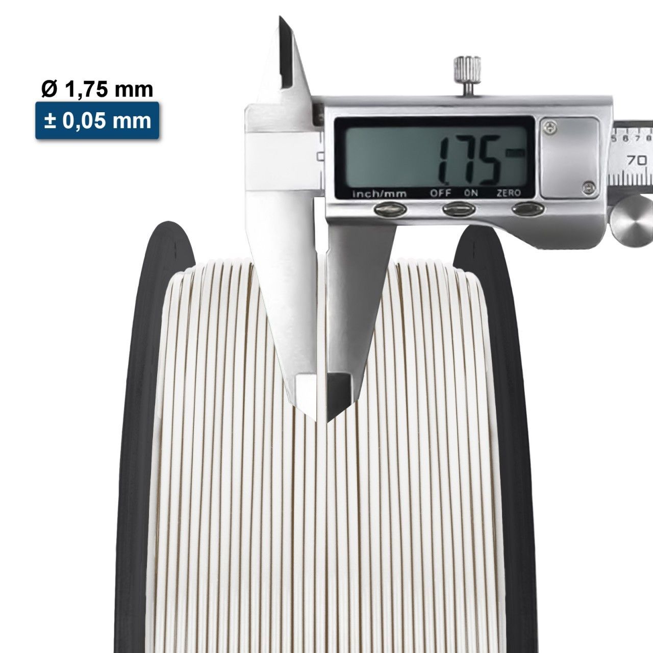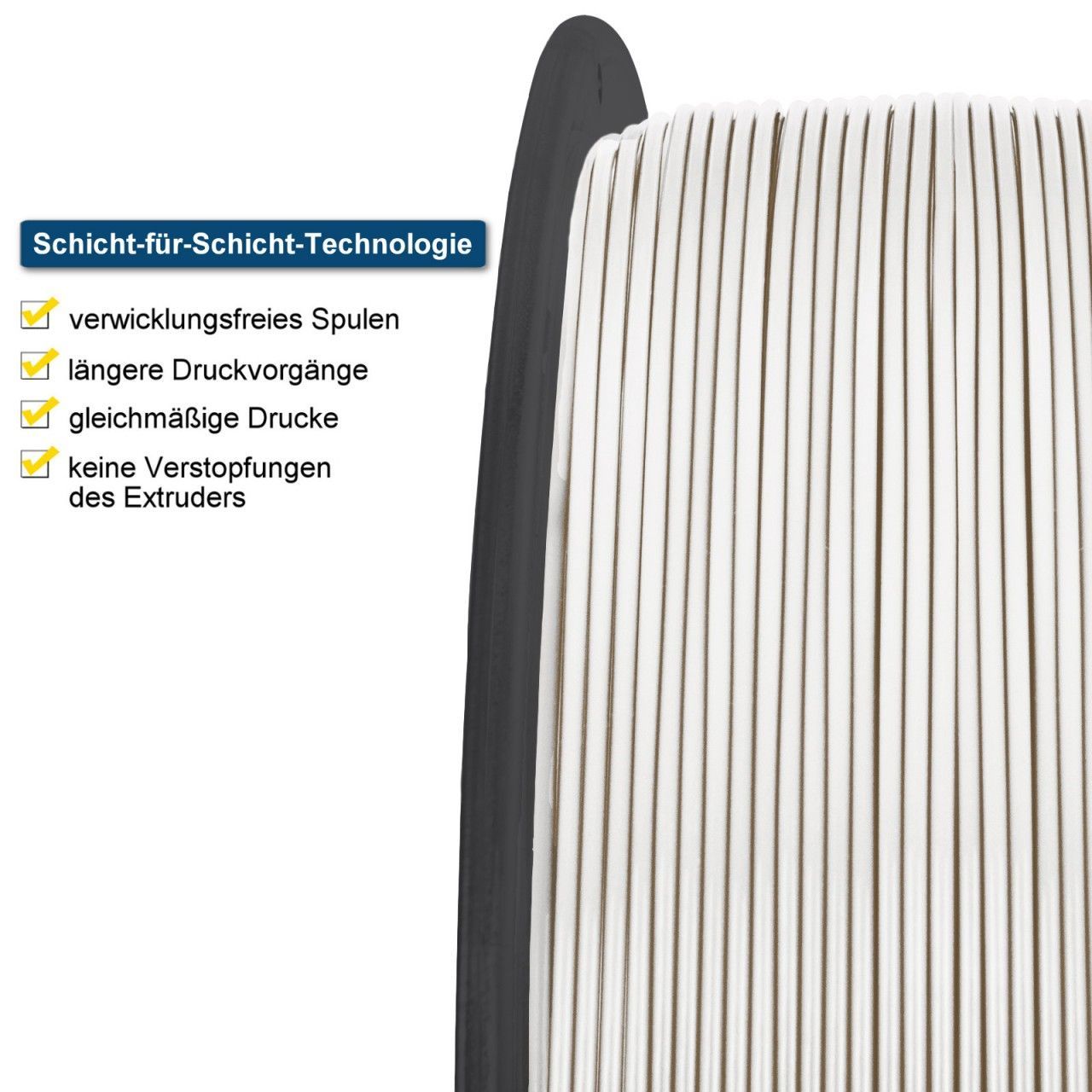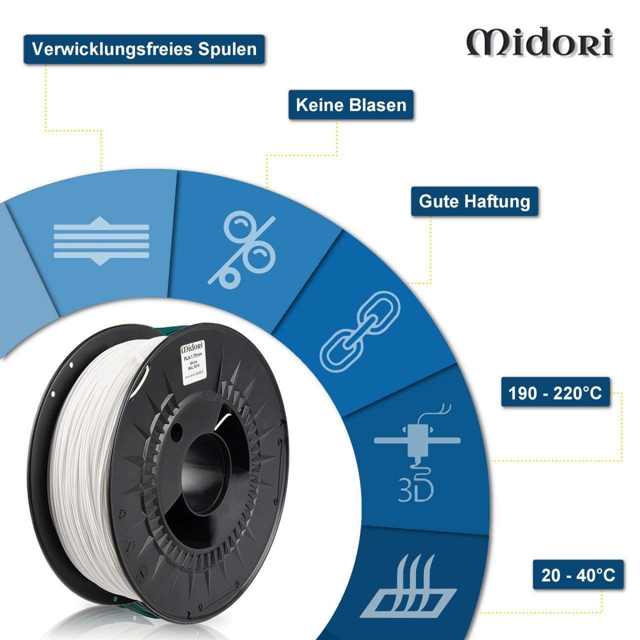 MIDORI® 3D Drucker 1,75mm PLA Filament 1kg Spule Rolle Premium Weiß RAL9016 Midori Qualitätsfilamente Wir haben es mit unseren Midori Filamenten zur Aufgabe gemacht Ihnen ein qualitativ hochwertiges Filament und Sintermaterial anzubieten, das sich deutlich in den Eigenschaften der Rundheit, Maßhaltigkeit und Farbechtheit vom Markt abhebt, denn nichts ist bedauerlicher, als wenn ein Druckvorgang nach einigen Stunden Laufzeit aufgrund von schlechtem Material abbricht, oder sich Farben nicht reproduzierbar abbilden lassen. Qualitätsware für Qualitätsdrucke Unsere Midori 3D-Filamente zeichnen sich durch eine sauber gewickelte Spule, eine perfekte Rundheit, sowie umfassende Kompatibilität mit verschiedenen FDM-3D-Druckern und -Stiften aus. Somit profitieren Sie mit unseren Filamenten von reibungslosen Drucksitzungen, sowie hervorragenden Druckresultaten. Hervorragende Ergebnisse dank reinem PLA Unsere Midori PLA 3D-Filamente bestehen im Unterschied zu herkömmlichen PLA Konkurrenzprodukten aus reiner PLA (Polylactic Acid/Polymilchsäure). Die reine PLA hat gegenüber herkömmlichen Mixturen den Vorteil einer besseren Formgebung ohne Blasenbildung, Verstopfen oder Verziehen. Somit werden Ihnen glatte Ausdrucke mit hervorragender Schichthaftung und hoher Steifigkeit ermöglicht. Verwicklungsfreies Spulen für glatte Druckabläufe Die hochwertigen Midori 3D-Filamente bewerkstelligen dank ihrer Schicht-für-Schicht-Technologie ein verwicklungsfreies Spulen und saubere Windungen, sodass längere Drucke problemlos ohne Verknotungen, Kreuzungen oder Überlappungen bewältigt werden können. Dadurch werden nicht nur extrem gleichmäßige Drucke sichergestellt, sondern auch mögliche Verstopfungen im Extruder verhindert. Konstanter Durchmesser in jedem Zentimeter Mit unseren 1,75 mm PLA 3D-Filamenten setzen wir auf höchste Präzision im gesamten Produktionsprozess. Die Herstellung der Filamente erfolgt unter strengsten Prüfungsmechanismen, sodass der Durchmesser der hochwertigen Filamente in jedem Zentimeter eine Toleranz von nur +/- 0,05 mm aufweist. Der daraus entstehende nahezu konstante Filament-Durchmesser verhindert Verstauungen und sorgt für ein reibungsloses Drucken ohne Unterbrechungen, woraus beim Drucken eine minimale Schrumpfung, stärkere Schichthaftung, sowie eine glattere Oberfläche resultieren. PLA - Das umweltfreundliche Material Die Midori PLA 3D-Filamente werden aus Polymilchsäure (Polylactic Acid) gefertigt. Diese wird aus erneuerbaren und natürlichen Rohstoffen wie z. B. Mais gewonnen. Das natürliche Material ist 100%-ig biologisch abbaubar und damit unbedenklich für die Umwelt. Außerdem bringt die PLA den Vorteil mit sich, dass diese im Unterschied zu anderen Kunststoffen völlig geruchsneutral ist. Optimaler Schutz & ideale Lagerbedingungen dank sicherer Verpackung Unsere Midori 3D-Filamente sind auf extrem hochwertigen transparenten Spulen gewickelt, die anders als herkömmliche minderwertige Spulen für optimale Druckresultate auch beheizt werden können. Jede Spule ist mit Informationen über die Materialart, die Farbe (gegebenenfalls mit Angabe der RAL-Nummer), den Durchmesser und die Drucktemperatur versehen. Zum Schutz vor Staub und Fremdstoffen werden die Midori 3D-Filamente anders als herkömmliche Konkurrenzfilamente mit einem Feuchtigkeitsschutz-Beutel in einer wiederverschließbaren feuchtigkeits- und lichtundurchlässigen Aluminiumpackung vakuumversiegelt, womit optimale Lagerbedingungen geschaffen werden. Damit der optimale Zustand der Filamente bei ihrer Ankunft sichergestellt werden kann, werden die Spulen jeweils in eingeschweißten Umkartons verpackt. Weite Kompatibilität mit vielen FDM-3D-Druckern und -Stiften Die 1,75 mm Midori PLA 3D-Filamente sind universell entwickelt worden und weisen eine breite Kompatibilität mit den meisten FDM-3D-Druckern und -Stiften für 1,75 mm Filamente auf. Technische Daten Marke: Midori Material: PLA (Polylactic Acid) Drahtstärke: 1,75 mm Maßgenauigkeit: +/- 0,05 mm Inhalt: 1.000 g Länge: 345 m Farbe: Weiß (RAL9016) Empfohlene Drucktemperatur: 190 - 220°C Empfohlene Druckbetttemperatur: 20 - 40°C Spulendurchmesser: 200 mm Spulenbreite: 68 mm Spulennabenlochdurchmesser: 53 mm Spulenbruttogewicht: 1,25 kg Weitere Produktdaten Materialdichte: 1,24 g/cm³ Schmelzflussrate: 6 g/10 min (210°C, 2,16 kg) Zugdehnung: 6%, ASTM D882 Gekerbter Izod-Aufprall: 16 kJ/m² Zugfestigkeit: 53 MPa, ASTM D882 Wärmeformbeständigkeitstemperatur (HDT): 55°C Glasübergangstemperatur: 57°C Vorschlag zur Druckgeschwindigkeit: 30 - 120 mm/s Gewicht einer leeren Spule: 0,25 kg