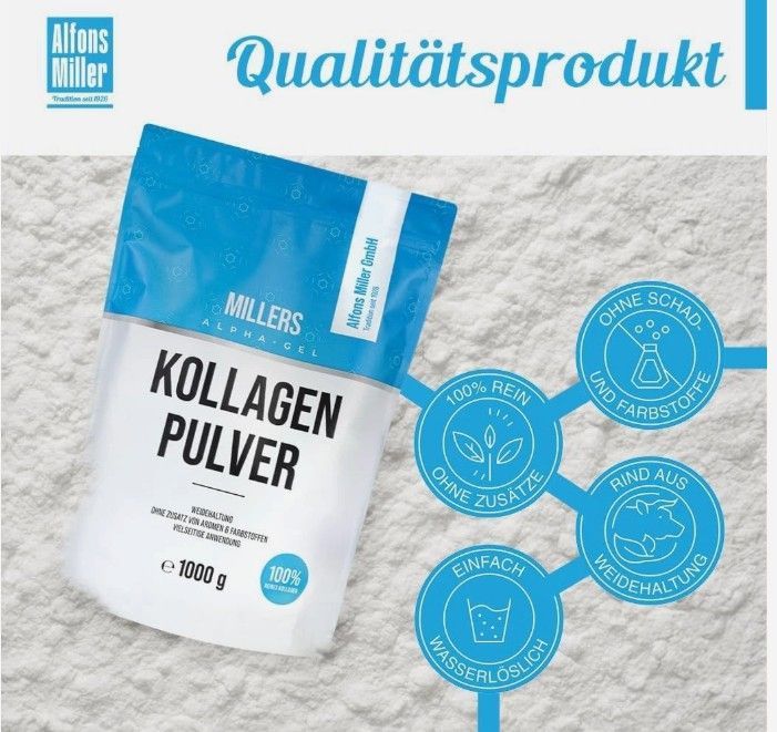 Praktische Anwendung: Wir empfehlen täglich 15 g Kollagen Pulver (Collagen Powder). Unser Collagen Pulver ist fein, wasserlöslich, geruchslos und löst sich schnell in Wasser, Saft, Tee, Shakes, Soßen, Suppen & Smoothies auf. Produktinformation Previous page Next page 1 1000g 2 300g Was ist unser
