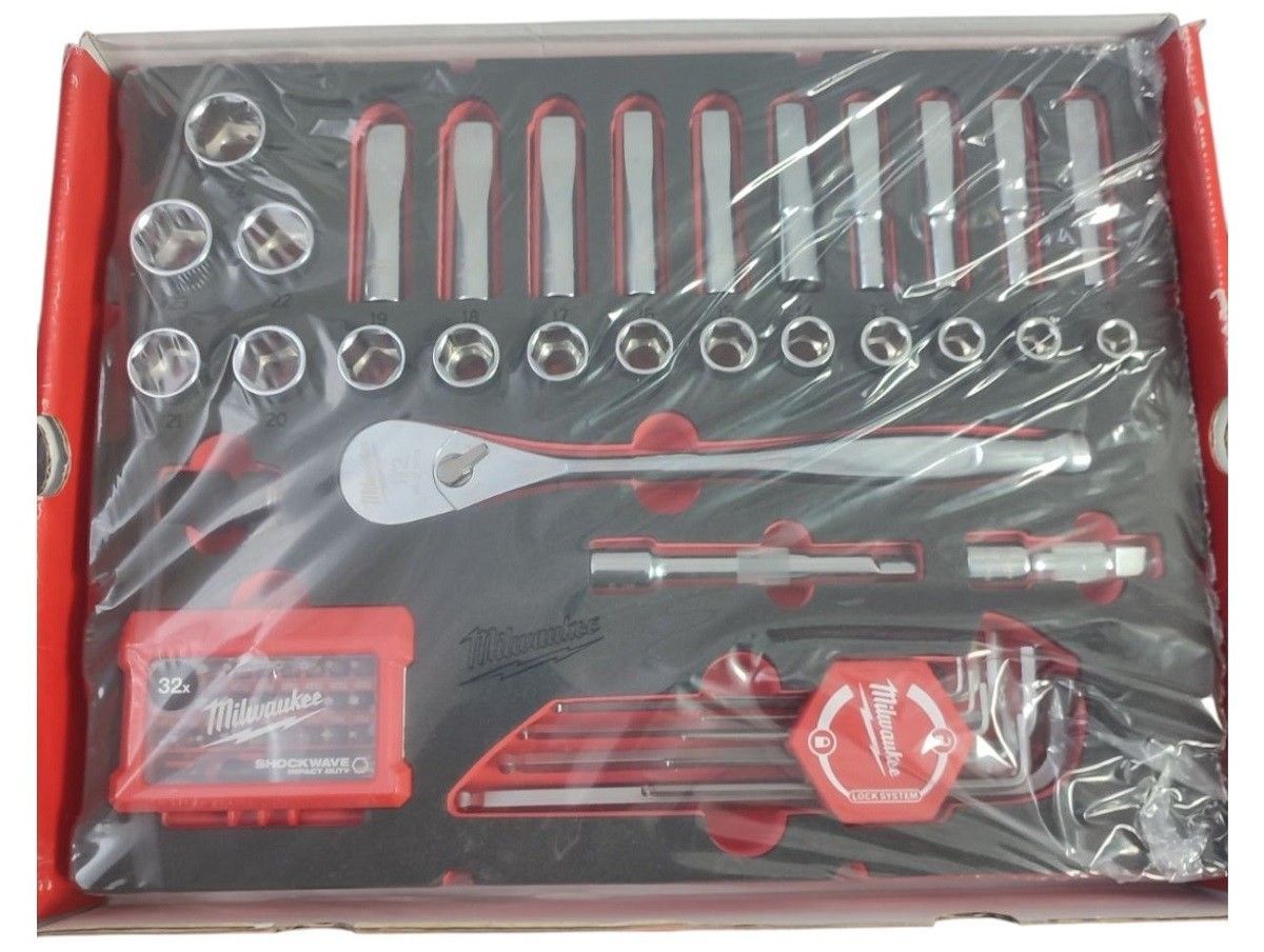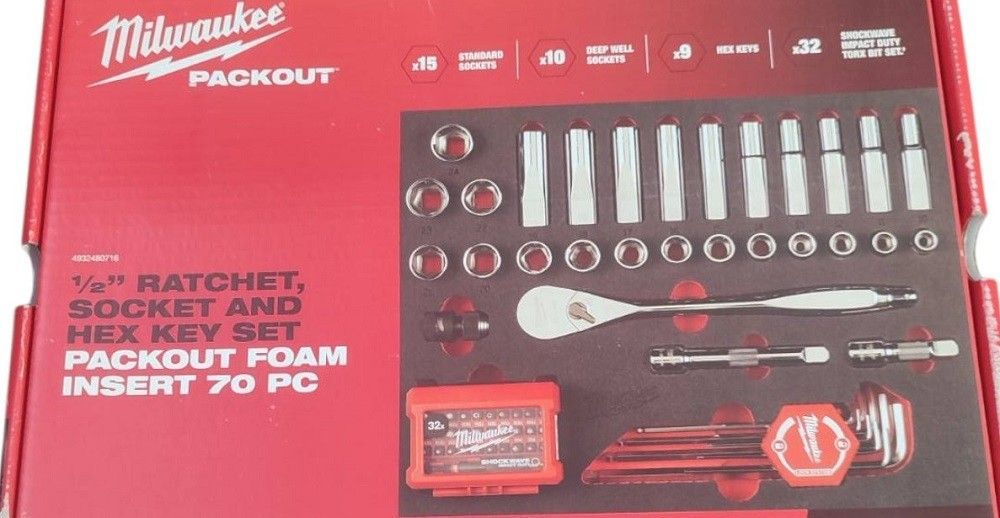 Milwaukee Ratschen und Steckschlüssel Packout Schubladenschaumstoffeinlage Spezifikation Passend für MILWAUKEE gemischtes Set Packungsmenge 70 Werkzeugempfang ¼″ Quadrat + ½″ Quadrat Inhalt ½″-Ratsche; 10 mm, 11 mm, 12 mm, 13 mm, 14 mm, 15 mm, 16 mm, 17 mm, 18