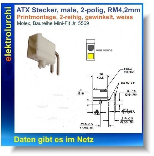 Sie bieten hier auf folgenden Artikel 2 Stück Mini-Fit 2-polig Leiterplatten-Stiftleiste, 2-reihig, gerade RM 4,2mm Molex 39301020 Passend für ATX Stromversorgung von PC's Polzahl: 1 (2 x 1Pins) Rastermaß: 4,2mm Ausführung: gewinkelt, Printmontage Kontaktanordnung: zweireihig Hersteller: Molex Herst