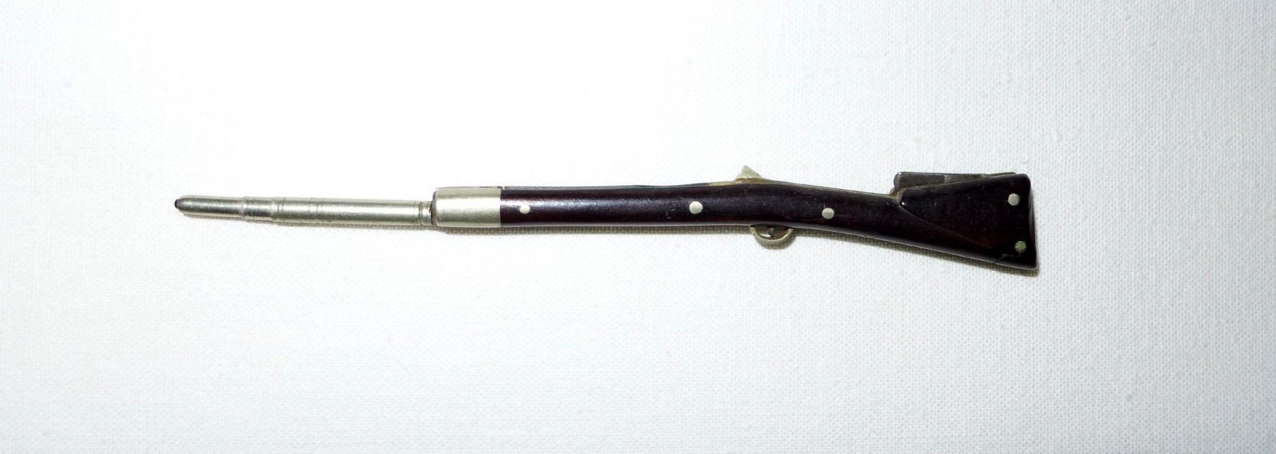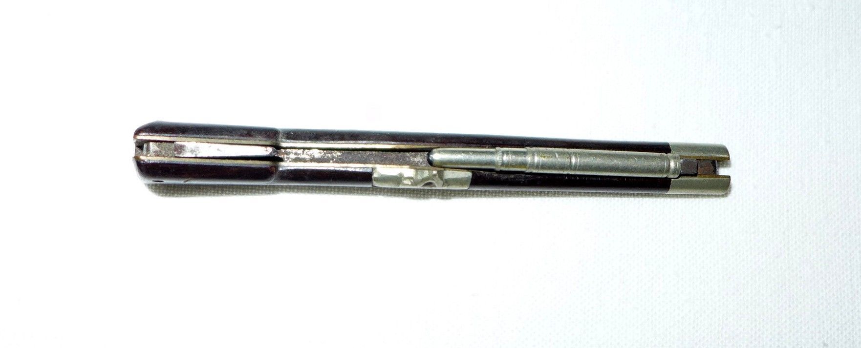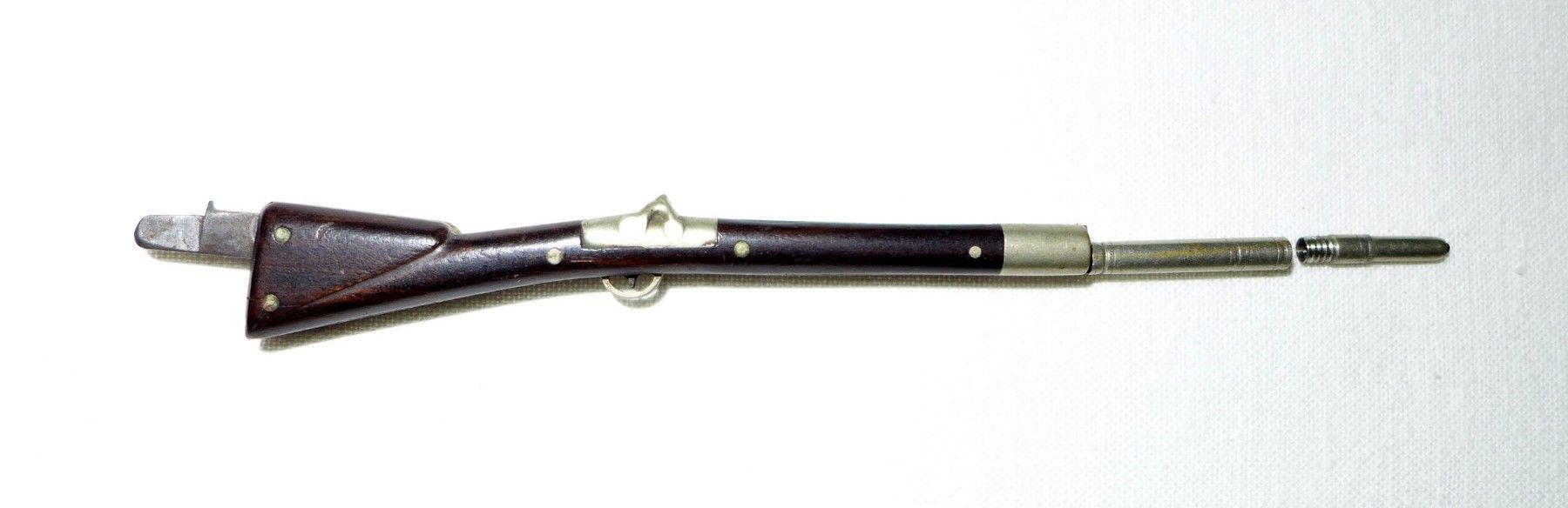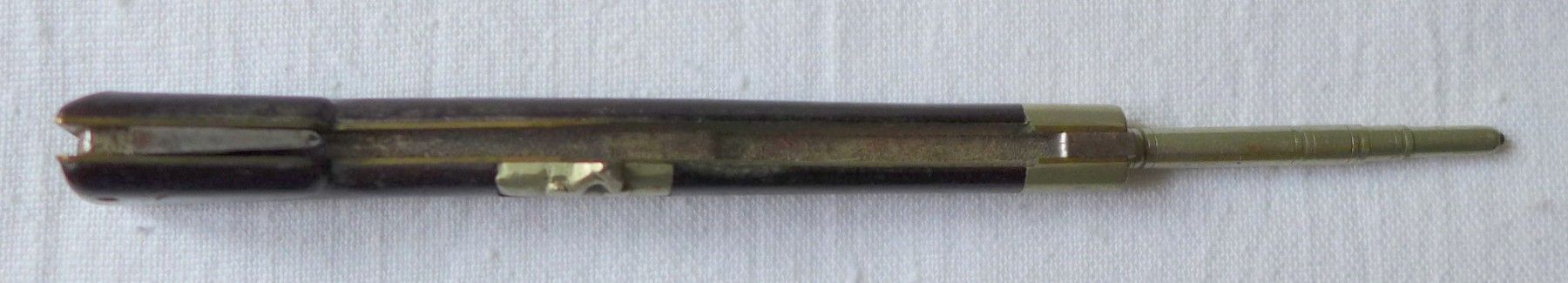 gebrauchter Zustand bitte den Bildern entnehmen , Gebrauchs - und Lagerspuren siehe Fotos , alt , antik , keine Neuware , der Lauf ( Bleistift ) ist einklappbar und aufschraubbar , die im Schaft befindliche Klinge ist gekürzt bzw. mal abgebrochen , Lichtspiegelungen , Schattenbildung , Farbabweichun