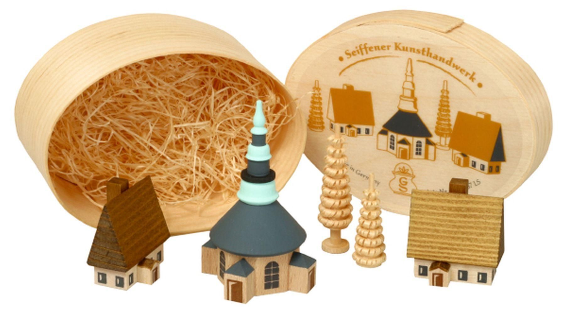 Miniaturfigur Spanschachtel mit Dorf Seiffen bunt Höhe 7 cm NEU Spielzeug Dekora