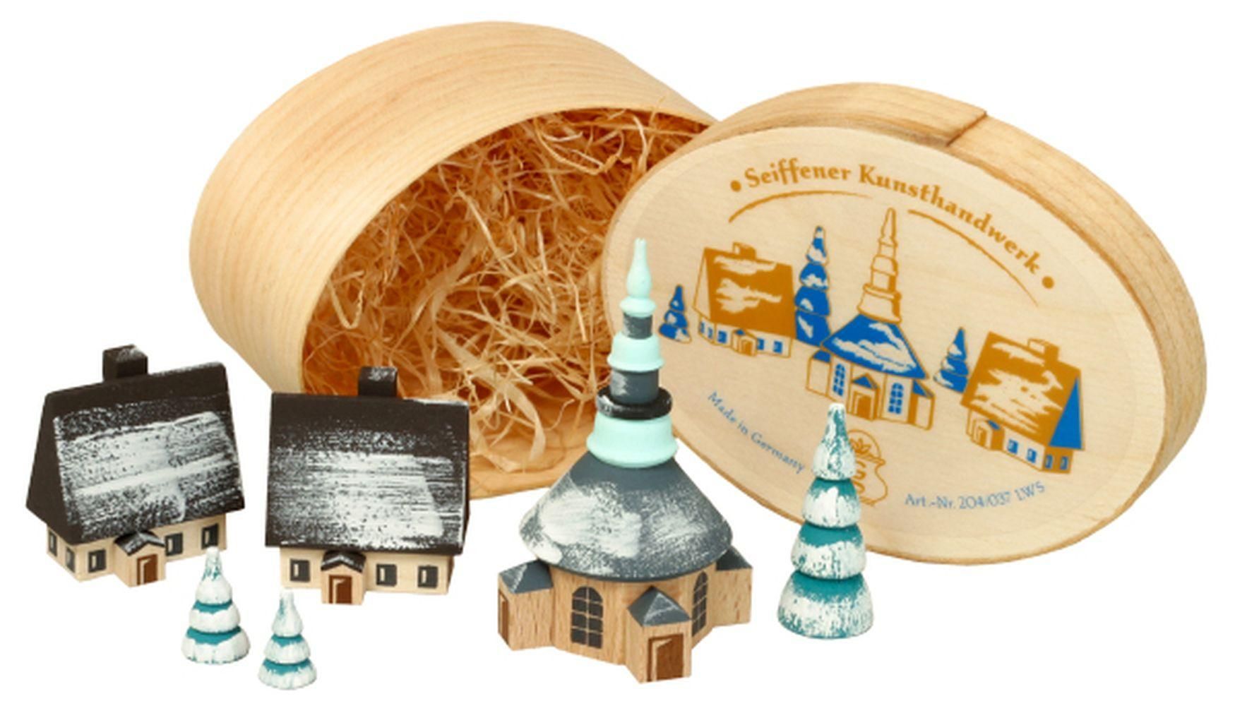 Miniaturfigur Spanschachtel mit Dorf Seiffen winterlich Höhe 7 cm NEU Spielzeug