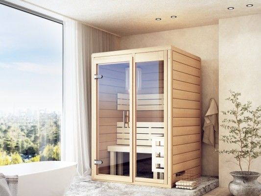 Minisauna 1,2 x 1,4m Höhe 2,02m Ob Wohnzimmer, Schlafzimmer oder Badezimmer, auch in der kleinsten Ecke findet sich ein Platz für die Mini - Innensauna. Dieses Sauna passt perfekt in jedes Zuhause und bietet einen ruhigen Rückzugsort. Ideal für Entspannung und Wohlbefinden. Dieses Luxusdesign ist mi