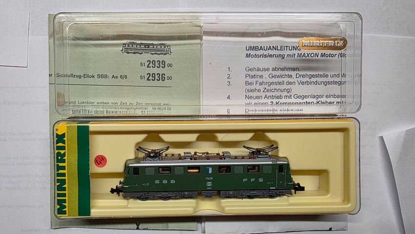 Minitrix 51 2939 00 SBB CFF Ae6 6 grün Elektrolok mit DCC-Digitaldecoder (ZIMO MX621), ohne Sound. Lok wurde nach SB Umbausatz mit einem Glockenankermotor (Maxon) ausgestattet. Steuerung: digital mit der Adresse 44 (kann umprogrammiert werden) Licht mit LED Ok, OVP, Bedienanleitung Lok im gebrauchte