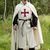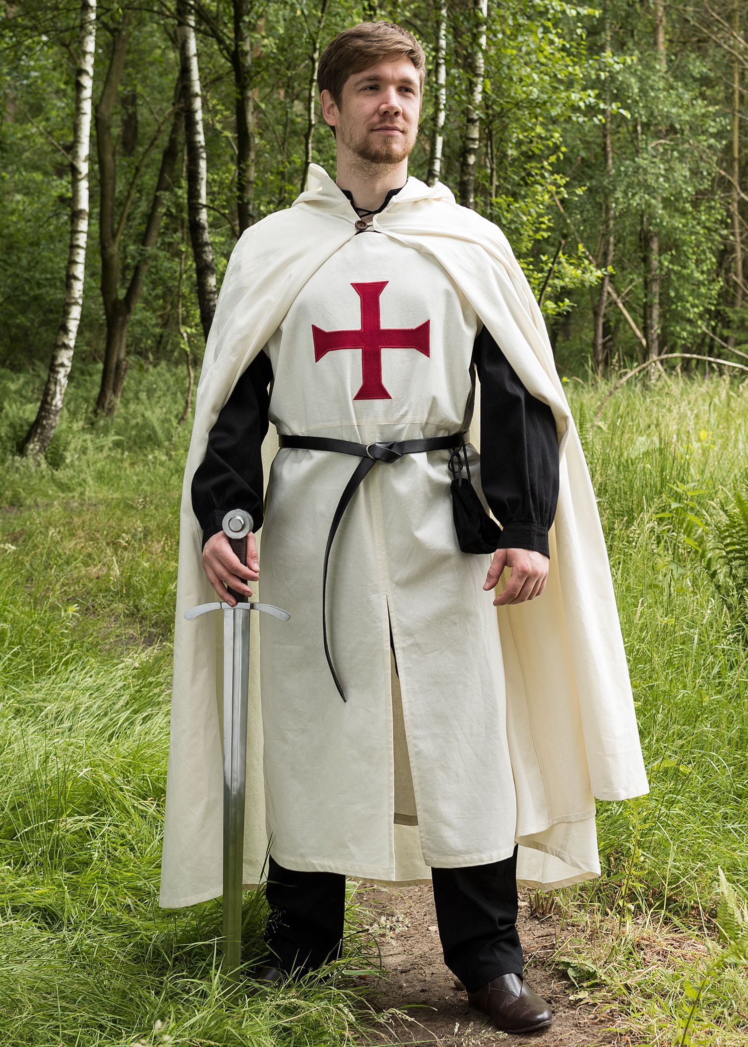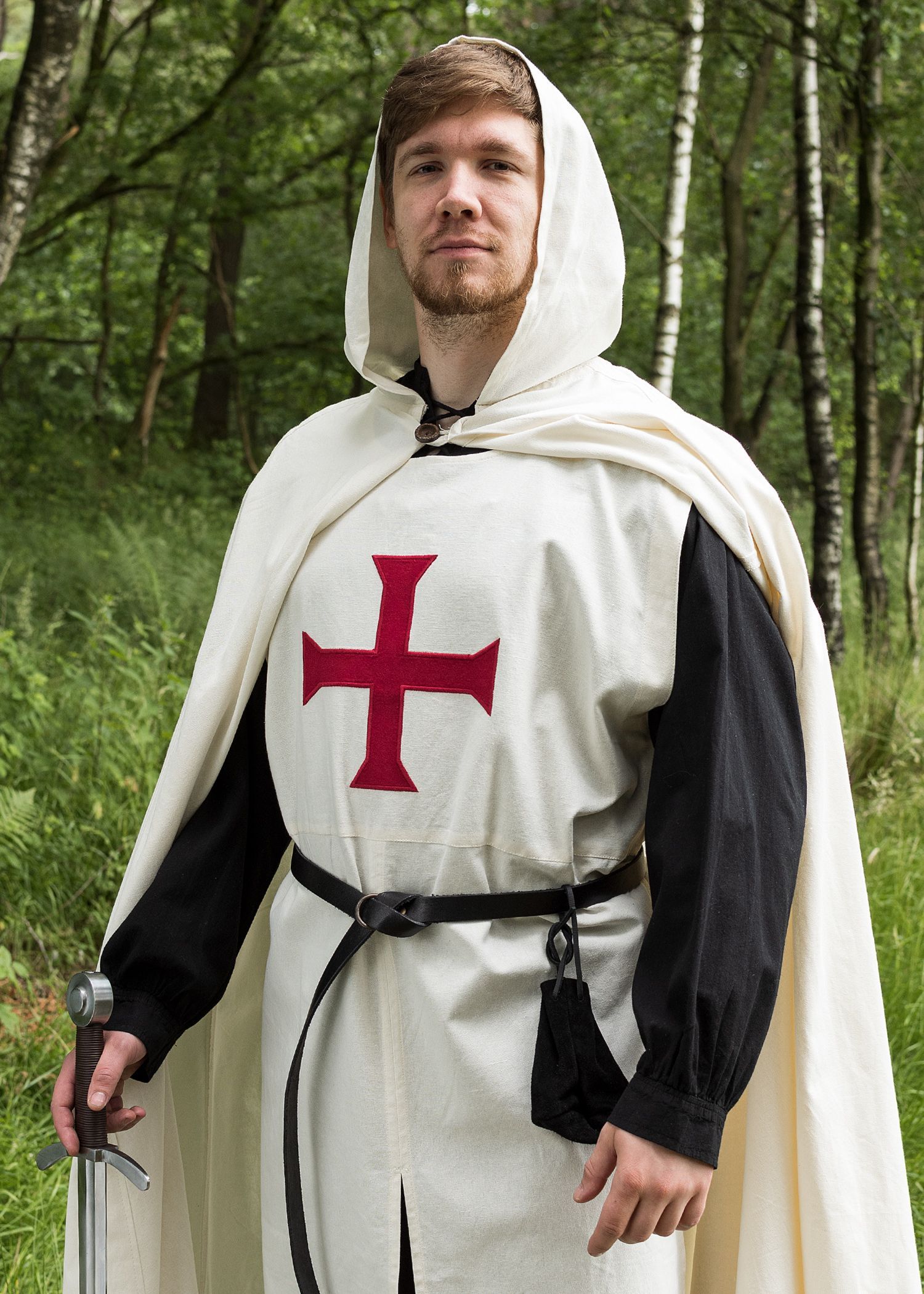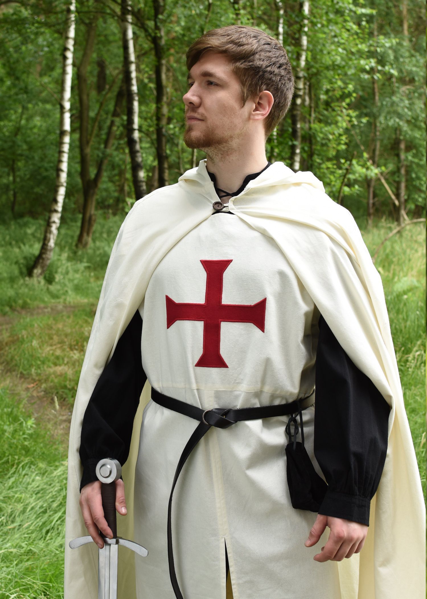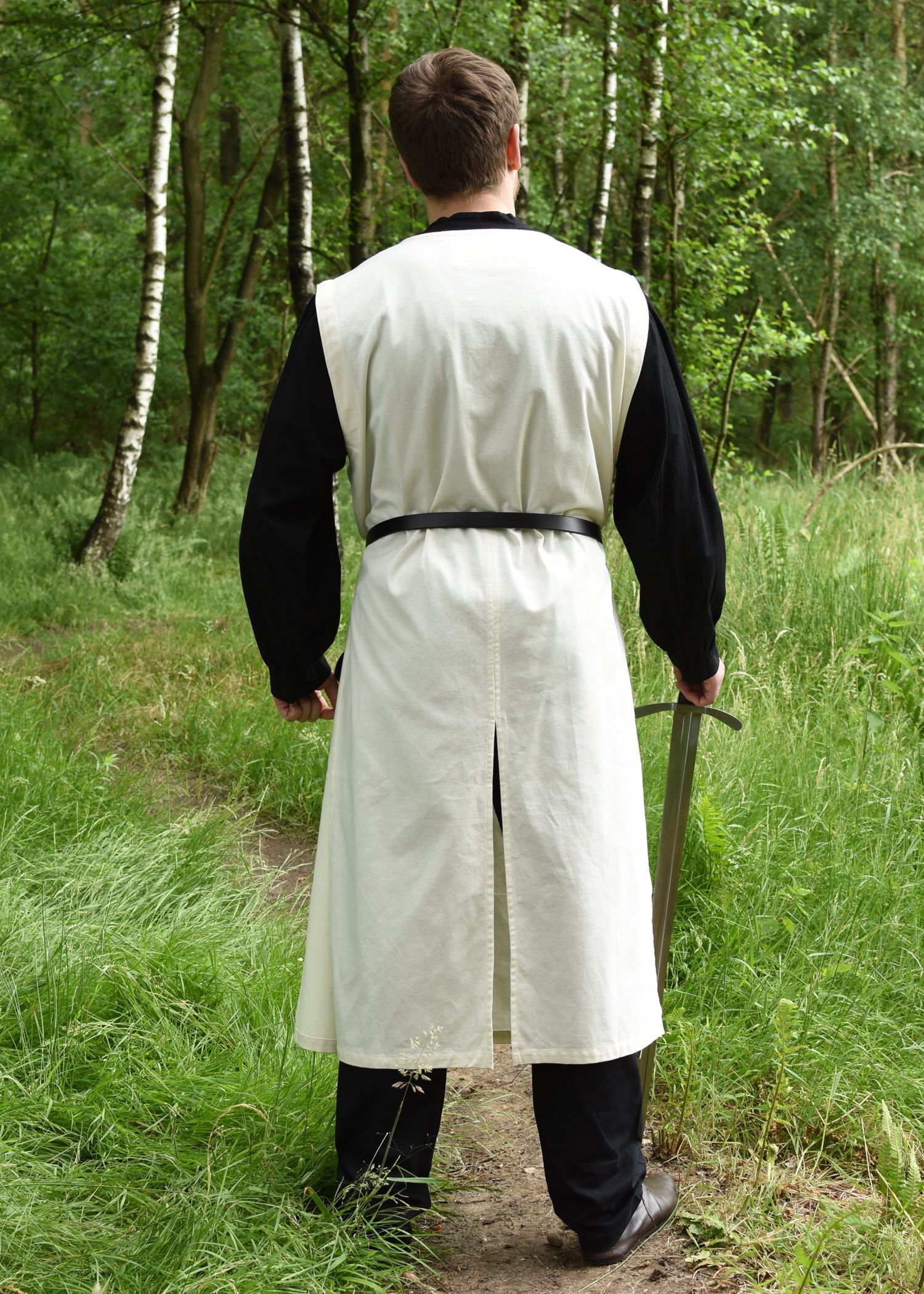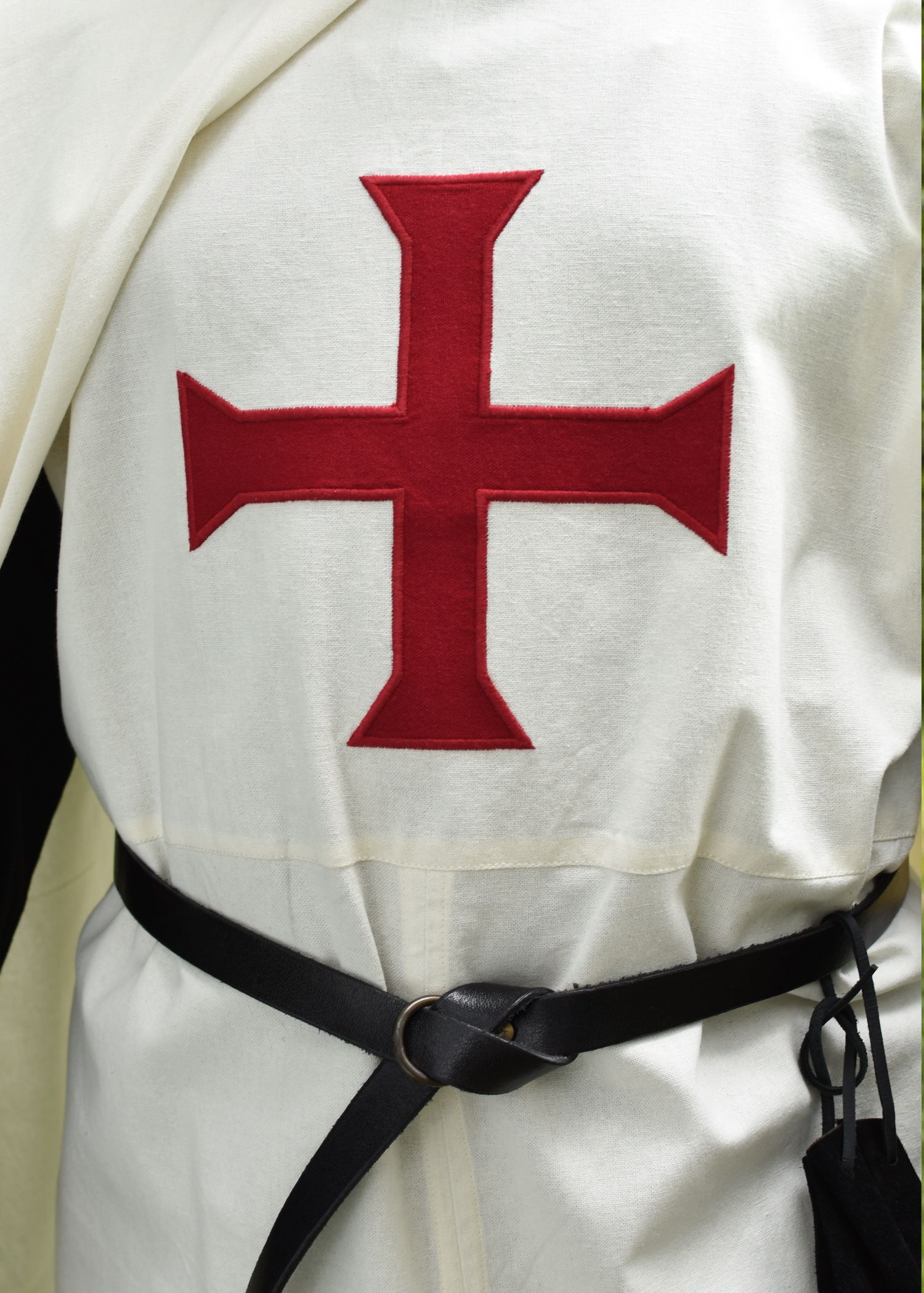 Mittelalter Wappenrock, Tempelritter, natur rot Dieser wadenlange Wappenrock ist aus festem Baumwollstoff gearbeitet. Er ist gerade geschnitten und seitlich bis zur Taille geschlitzt. Vorder- und Rückseite sind mittig ebenfalls mit einem etwas kürzeren Schlitz versehen. Auf der Brust ist das klassis