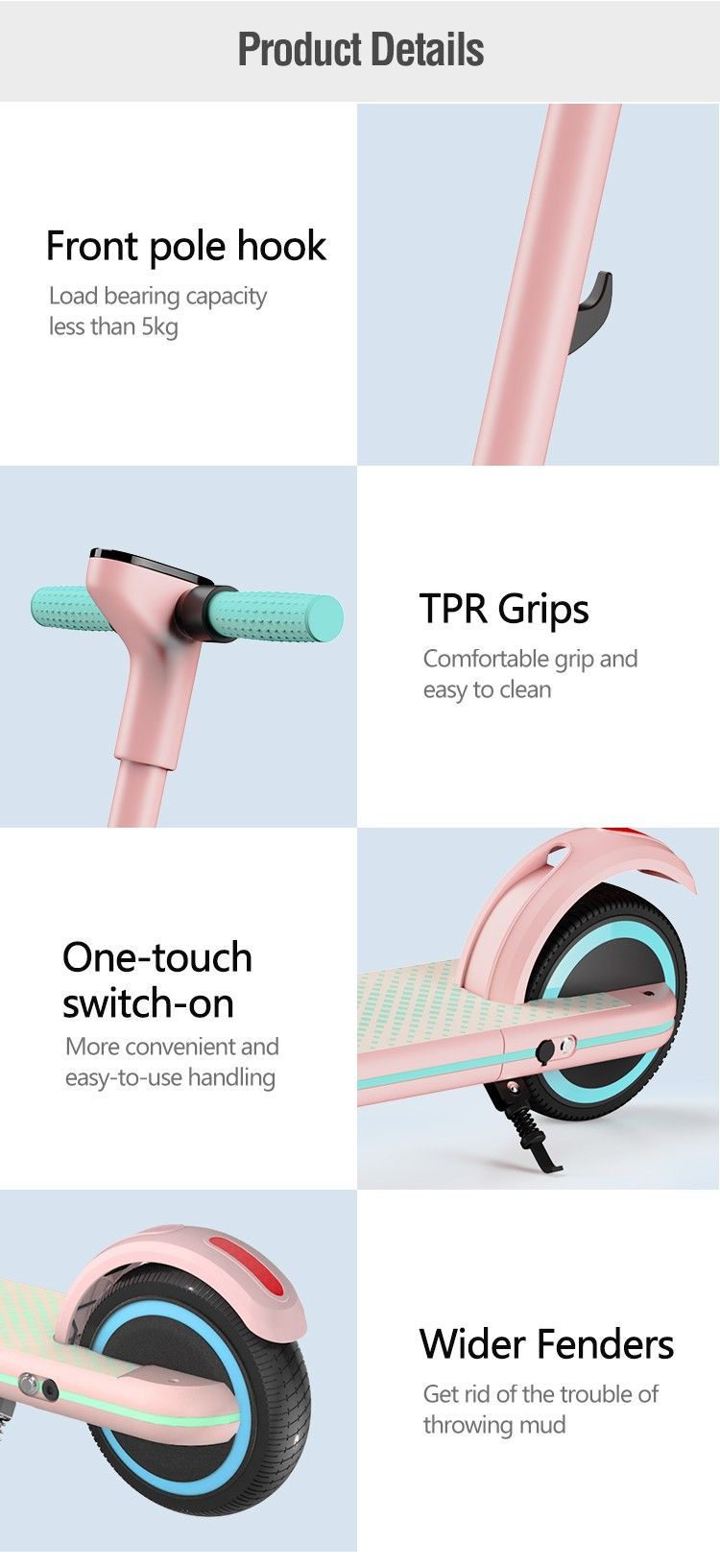 Motor: 130 W Höchstgeschwindigkeit: 14 km h Reichweite: 5–8 km Maximale Zuladung: 70 kg Akkukapazität: 24 V 2,5 Ah Maximaler Steigwinkel: 10° Reifen: 6,5-Zoll-Vorderrad + 5,5-Zoll-Hinterrad Bremsen: Fußbremse + elektrische Bremse LCD-Display: Ja Ladezeit: 2–3 Stunden Produktabmessung