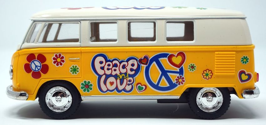 Modellauto T1 Bus Peace and Love 1962 gelb / beige Rückziehmotor