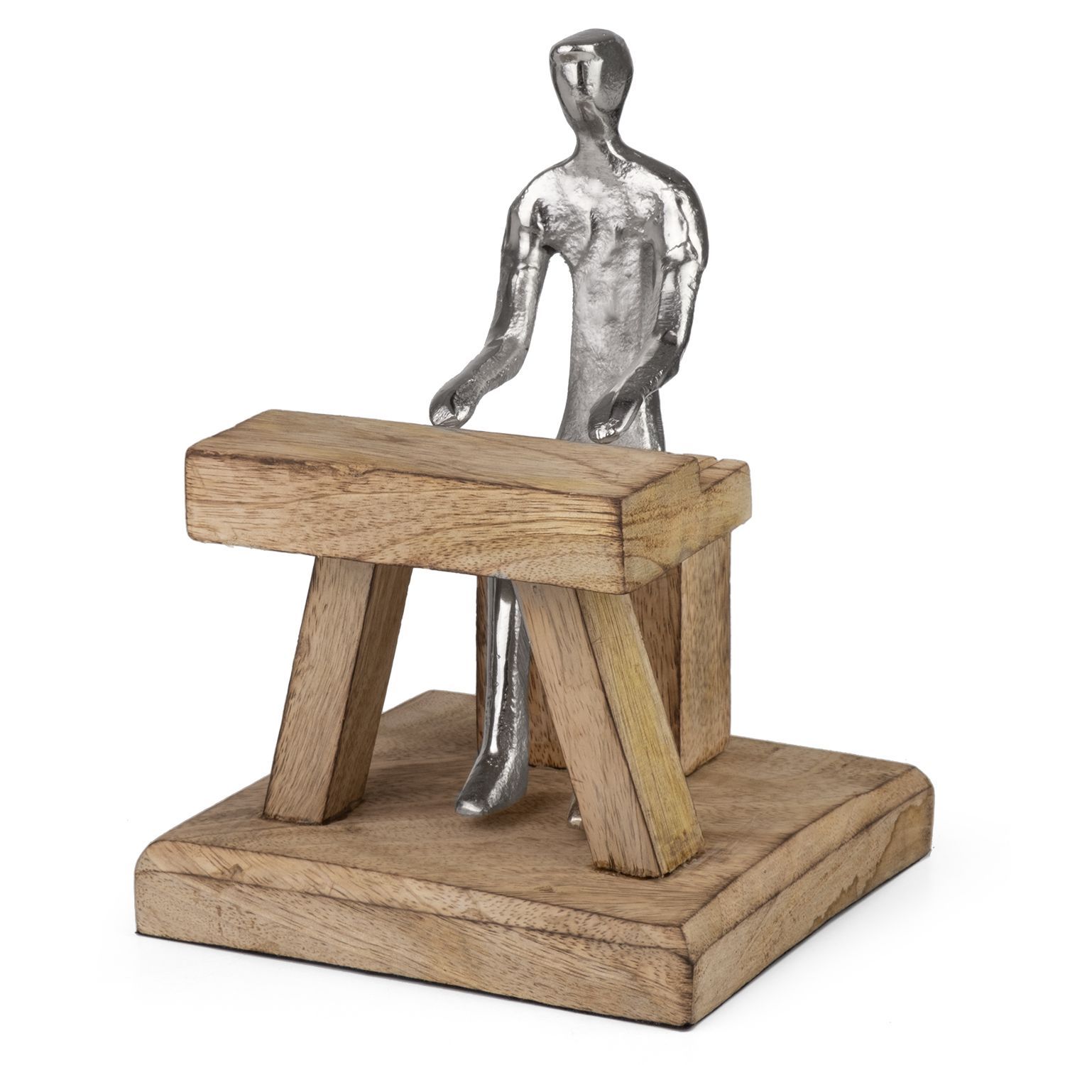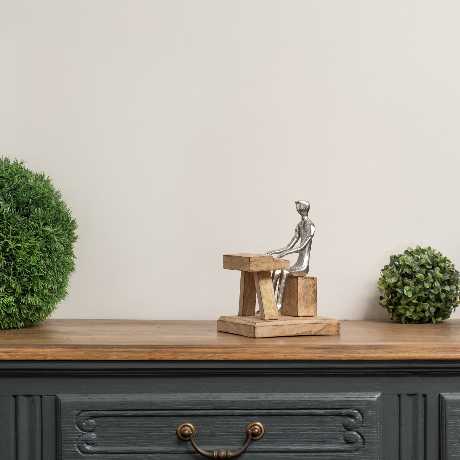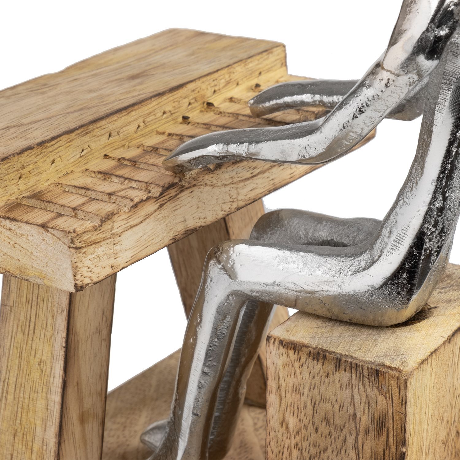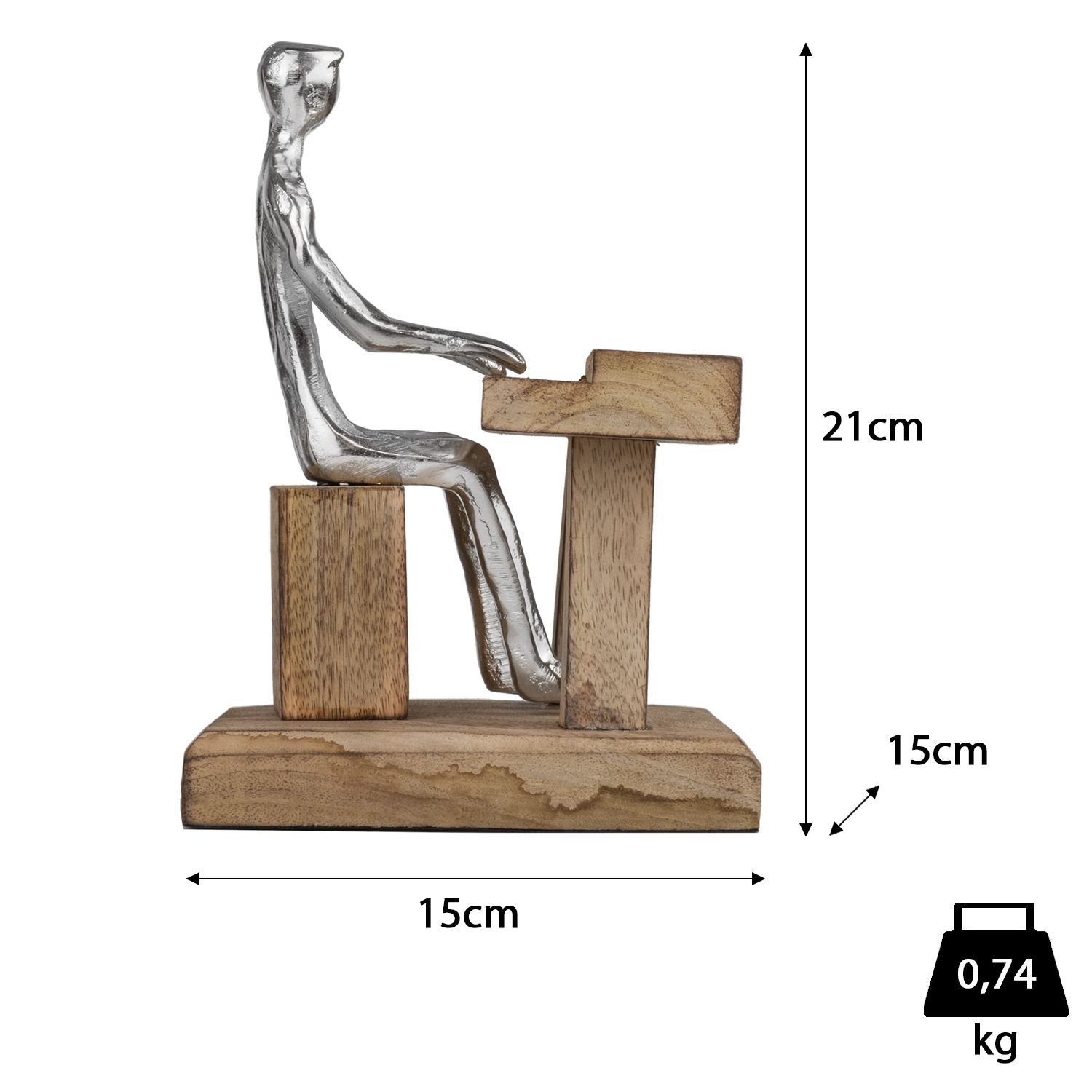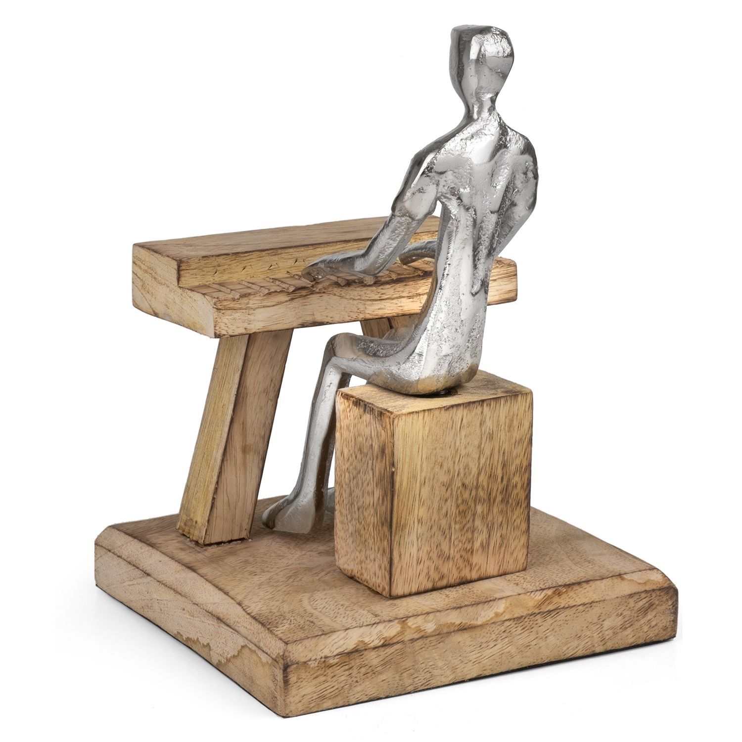 Moderne Pianist Figur am Klavier - stilvolle Skulptur aus Aluminium auf Mangoholzsock