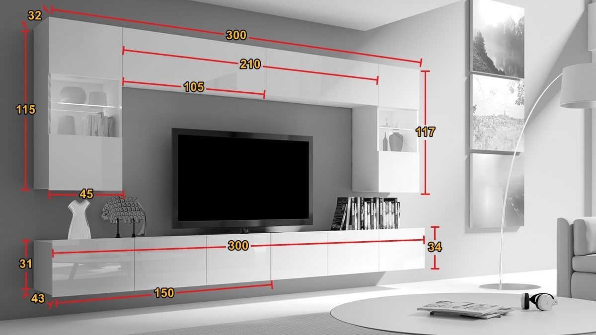 Wohnwand CALABRINI-1 Korpus: Spanplatte laminiert 16 mm, Fronten: Spanplatte laminiert in Hochglanz 15 mm, PVC-Furnier, ohne Griffe 5 cm silberne Füße optional gehärtetes Glas teilweise hochglänzend (Fronten Weiß und Schwarz) Spezifikation Maße TV-Lowboard: Breite: 150 cm, Höhe: 34 cm, Tiefe: 43 cm