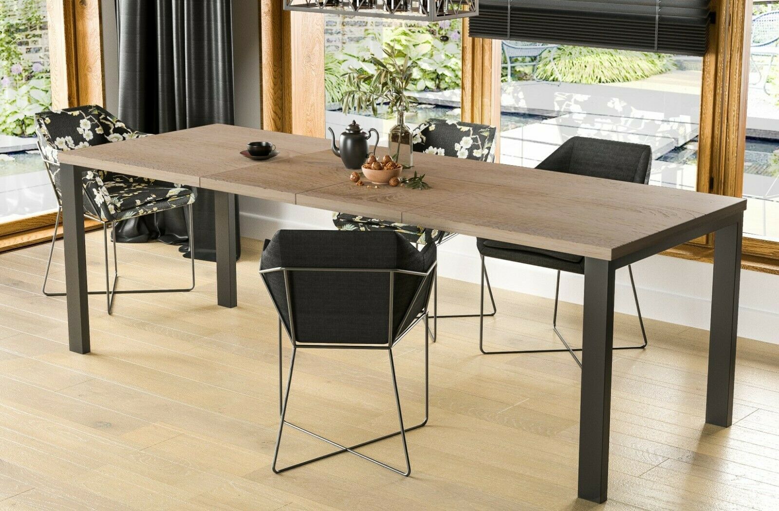 moderner Esstisch 130-175 cm Material: MDF Maße: Länge: 130-175 cm Breite: 80 cm Höhe: 76 cm Stabile und robuste Verarbeitung hochwertiges und langlebiges Nachbildungsfurnier Synchronauszug - mit einer Erweiterungsplatte 45 cm Tischplatte wird vormontiert geliefert Metallgestell schwarz pulverbeschi