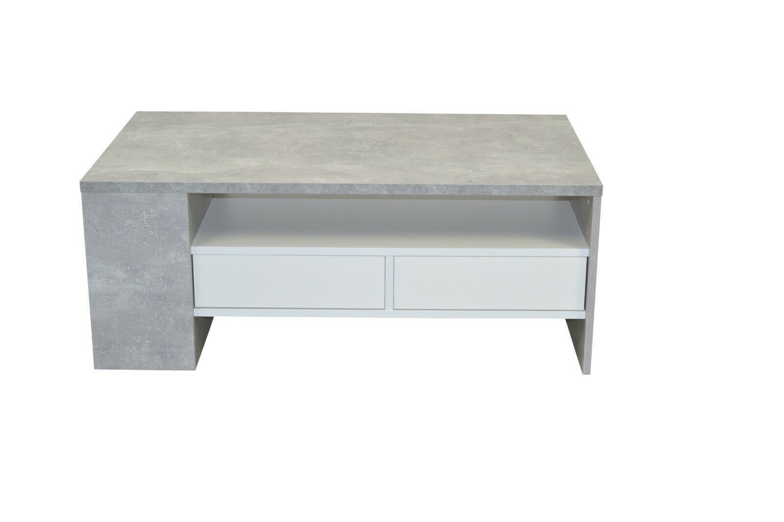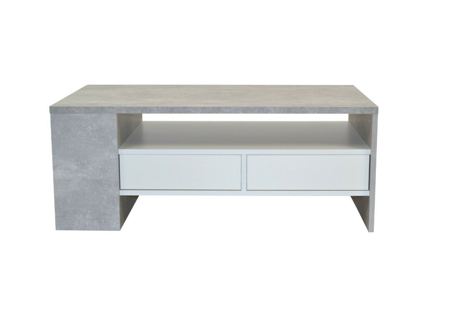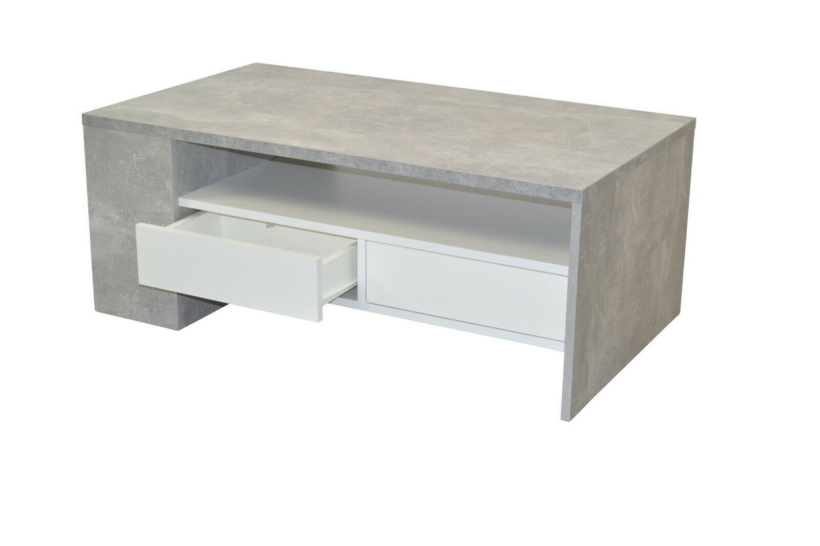 COUCHTISCH MODERNER COUCHTISCH MIT EINER PFLEGELEICHTEN, GLATTEN OBERFLÄCHE AUS HOLZWERKSTOFF, IN BETONOPTIK GRAU BECHICHTET, SCHUBKÄSTEN WEIß BESCHICHTET. OBEN GROßE TISCHPLATTE, DARUNTER BODEN UND 2 SCHBUKÄSTEN AUF METALLLAUFSCHINEN. LINKS OFFENES FACH MIT FESTEN BODEN. WIRD ZERLEGT GELIEFERT. MAß