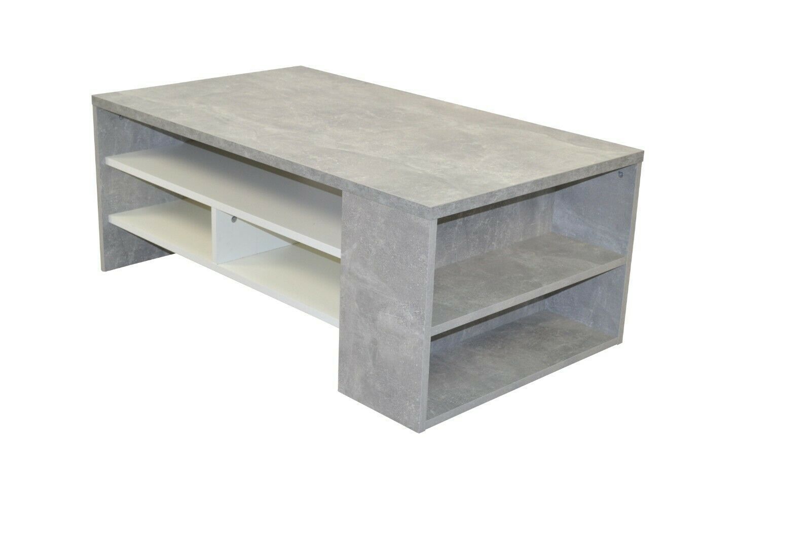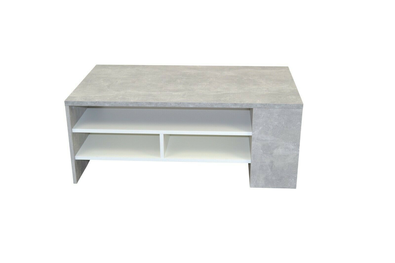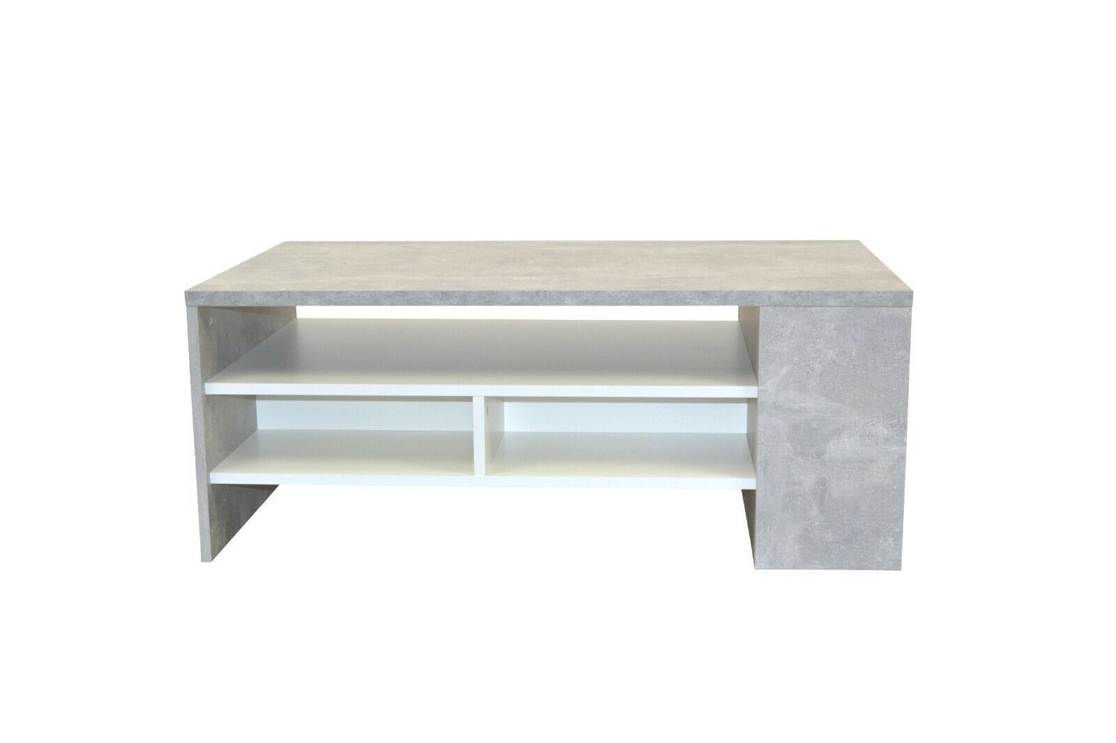 COUCHTISCH MODERNER COUCHTISCH MIT EINER PFLEGELEICHTEN, GLATTEN OBERFLÄCHE AUS HOLZWERKSTOFF, IN BETONOPTIK GRAU BECHICHTET, SCHUBKÄSTEN WEIß BESCHICHTET. OBEN GROßE TISCHPLATTE, DARUNTER BODEN UND 2 SCHBUKÄSTEN AUF METALLLAUFSCHINEN. LINKS OFFENES FACH MIT FESTEN BODEN. WIRD ZERLEGT GELIEFERT. MAß