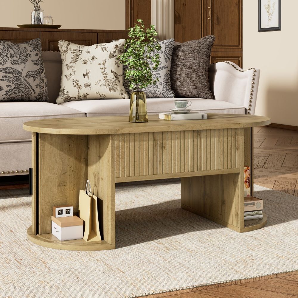 Moderner, höhenverstellbarer Couchtisch in Eichenoptik aus MDF. Ideal für Wohnzimmer, kleine Wohnungen und Homeoffice. Mit offenen Regalen, verstecktem Stauraum und Schiebetüren bietet er praktische Aufbewahrung. Maße: 100 × 50 × 40,5 cm. Gewicht: 16,2 kg.