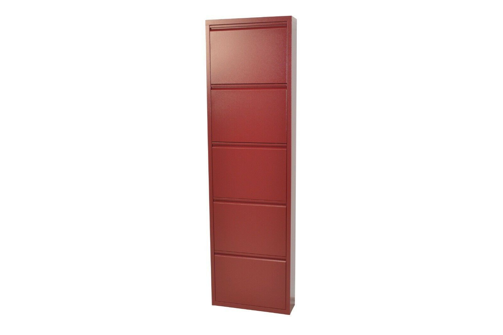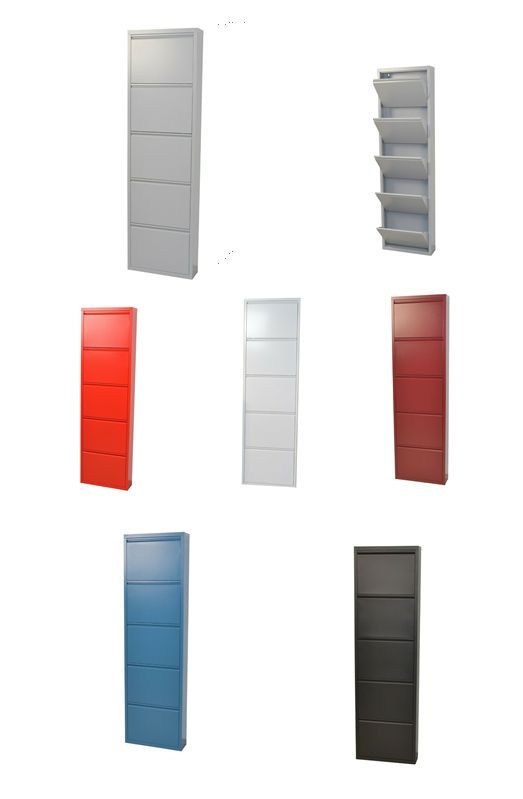 SCHUHSCHRANK Schuhschrank in 6 Farben für ca. 10 paar Schuhe bis Größe 44. Komplett aus Metall gefertigt. Die Klappen lassen sich alle auf einmal öffnen. Durch die geringe Tiefe sind sie bestens als Raumspar-Schuhschrank geeignet. Zur Wandmontage. Lieferung erfolgt aufgebaut. 5 Klappen für ca. 10 Pa