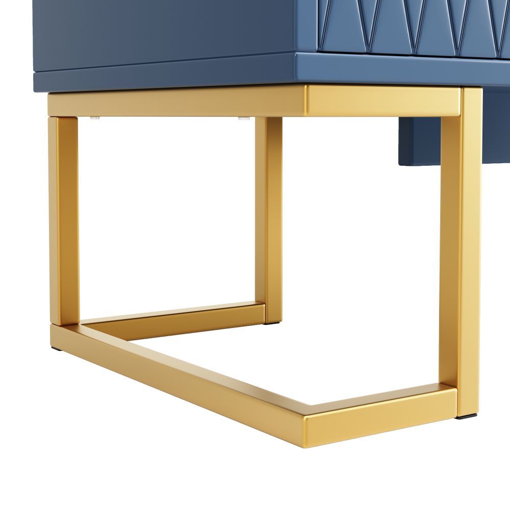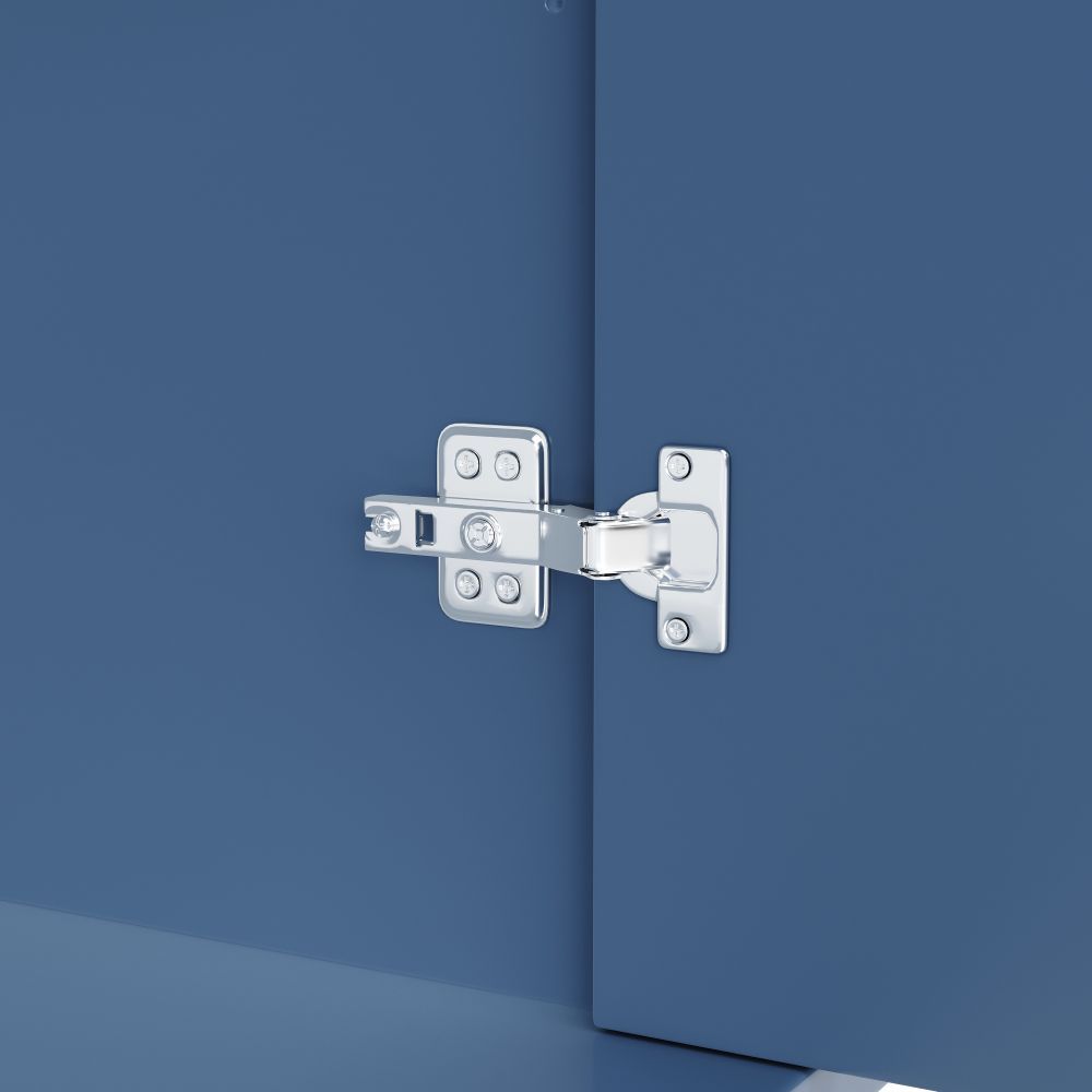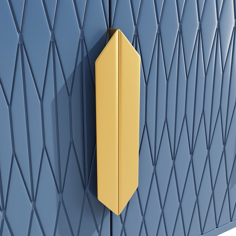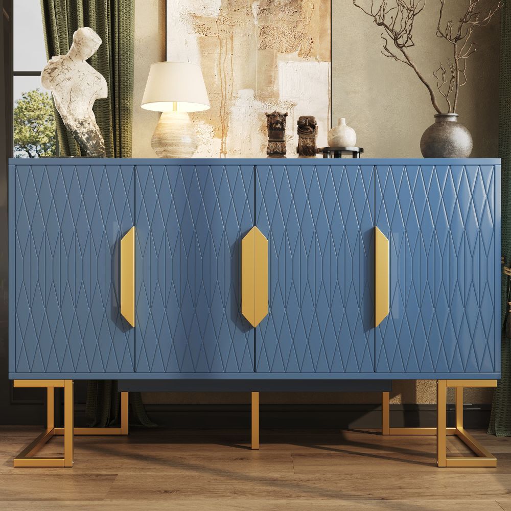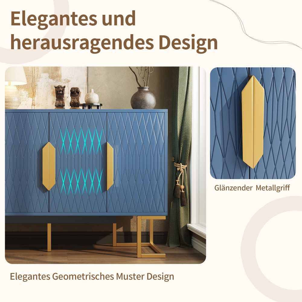 Moderner Seitenschrank im stilvollen Blau-Schwarz aus MDF und Metall. Mit vier Türen und zwei höhenverstellbaren Regalen bietet er vielseitigen Stauraum. Ideal als Aufbewahrungsschrank, Küchenschrank oder elegante Anrichte für verschiedene Wohnbereiche.