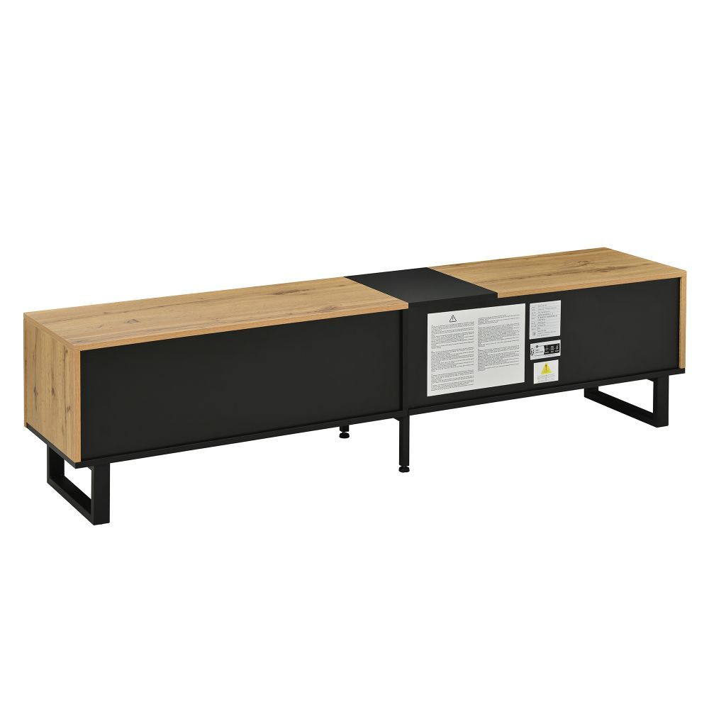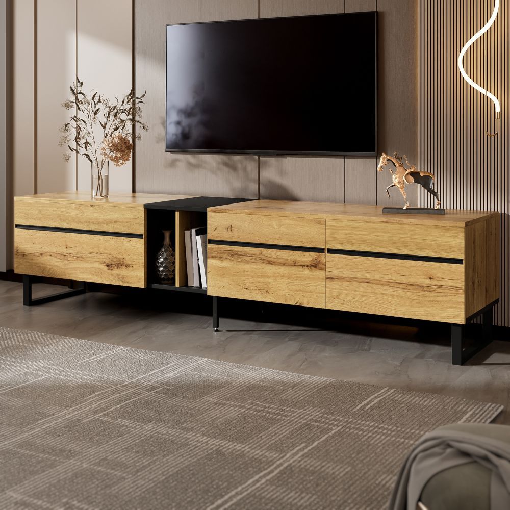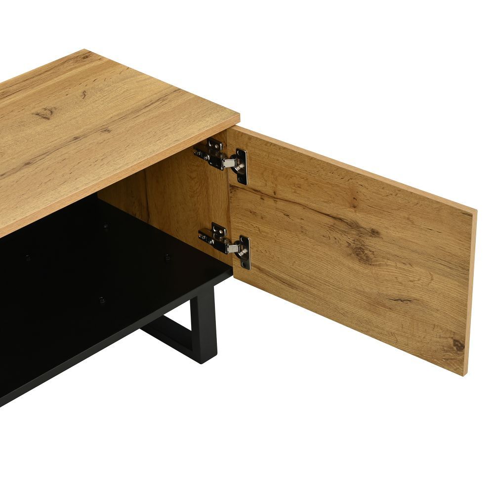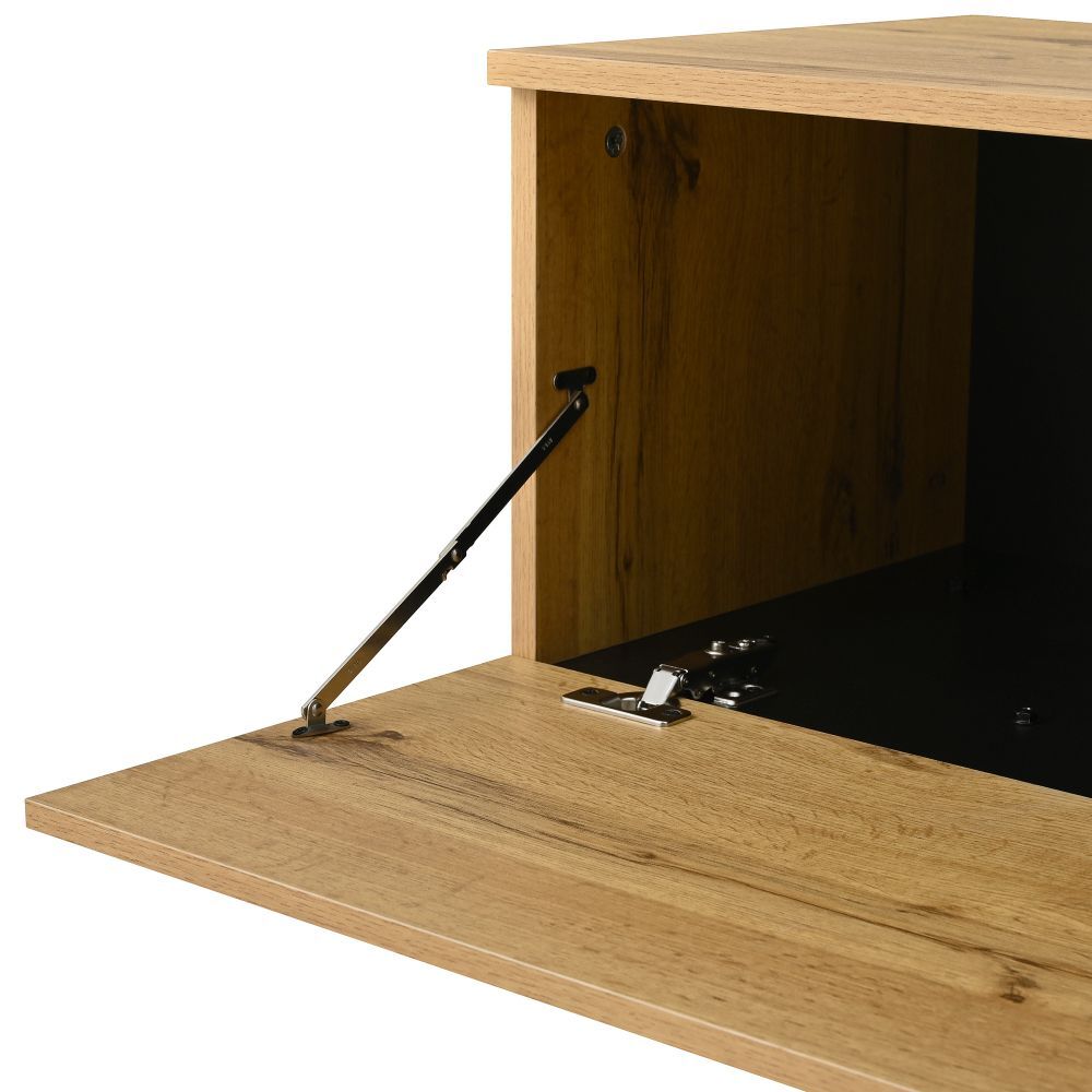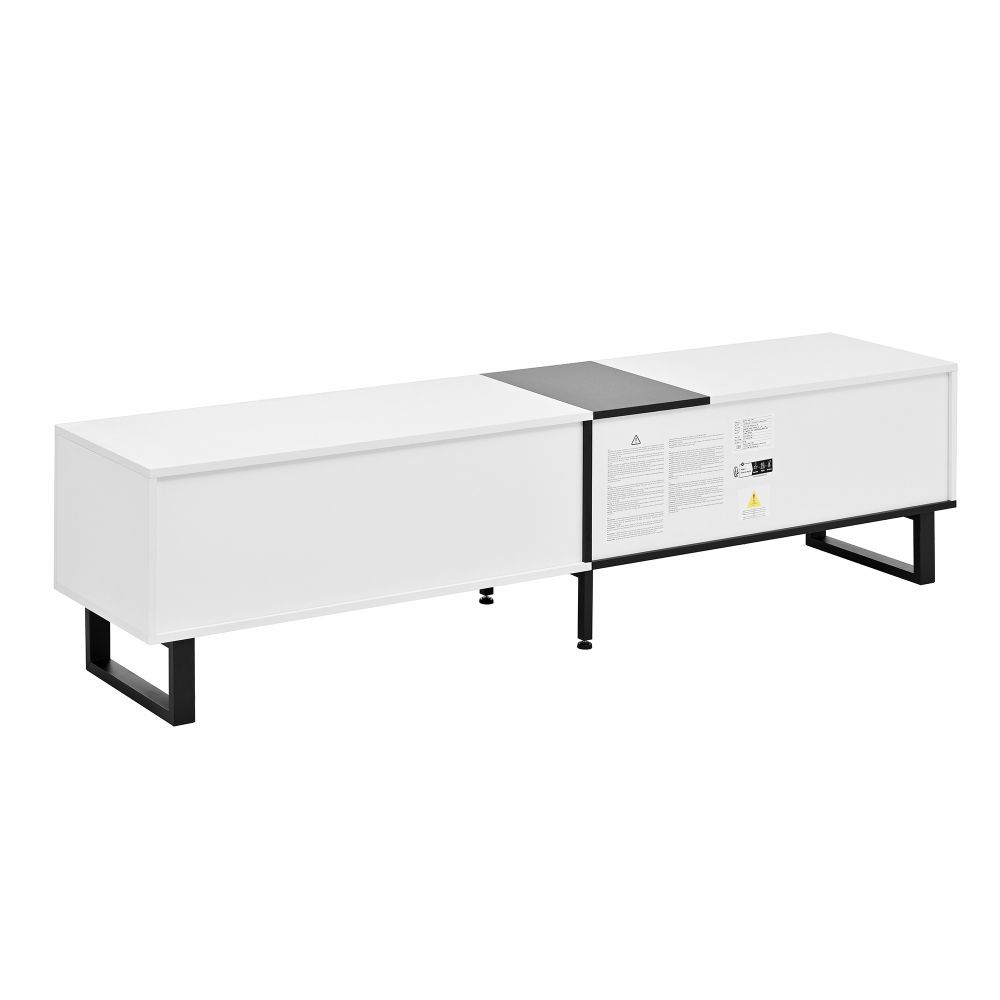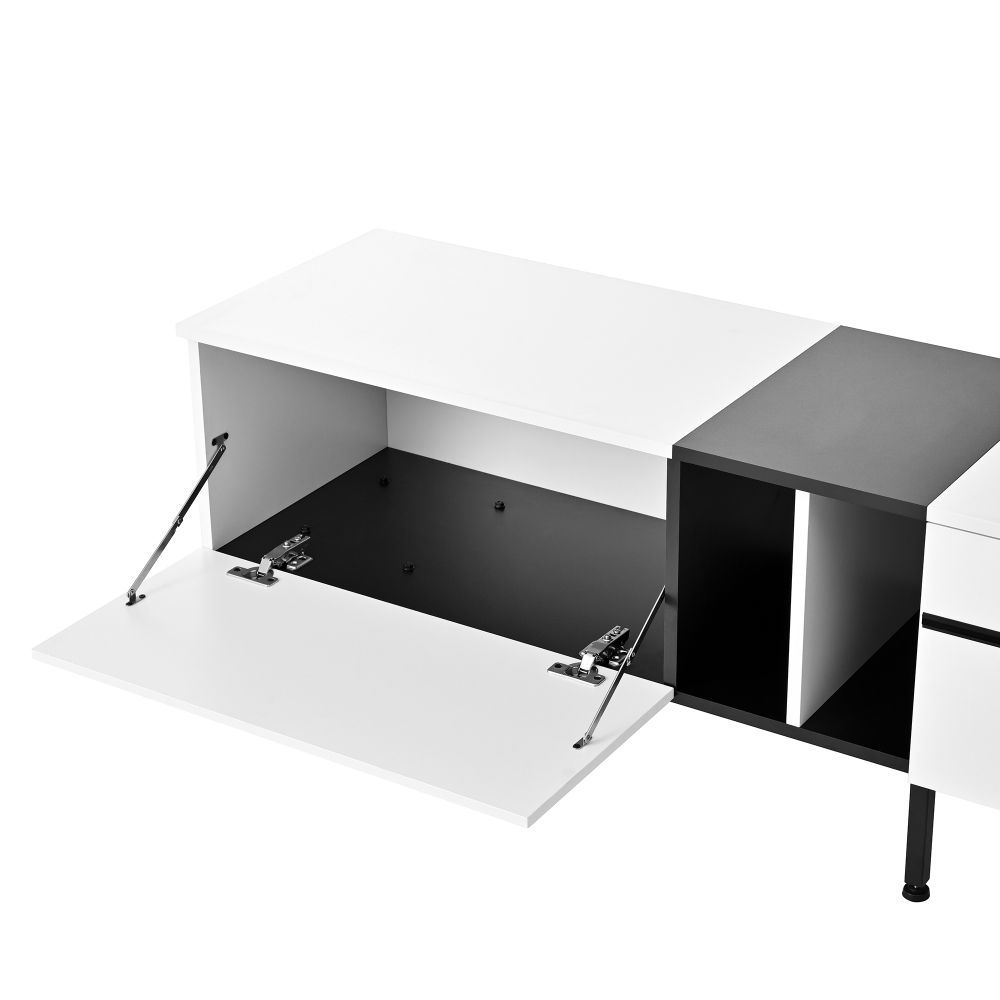 Modernes Lowboard im minimalistischen Design für Wohn- oder Essbereich. Mit Klappfach, offenen Fächern und Doppeltüren bietet es praktischen Stauraum für Mediengeräte, Bücher und Alltagsgegenstände. Gefertigt aus robuster Spanplatte, ideal als TV-Schrank oder Sideboard.