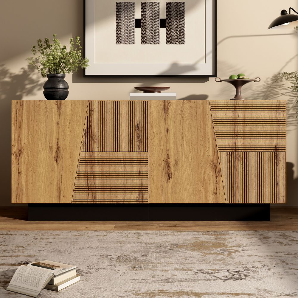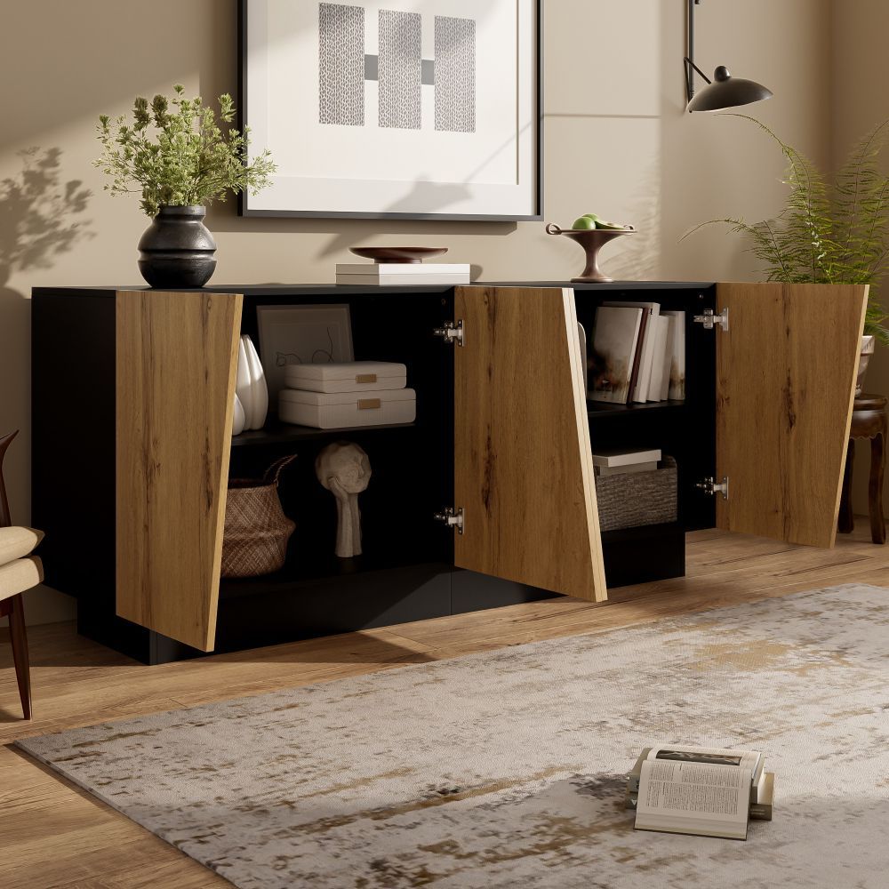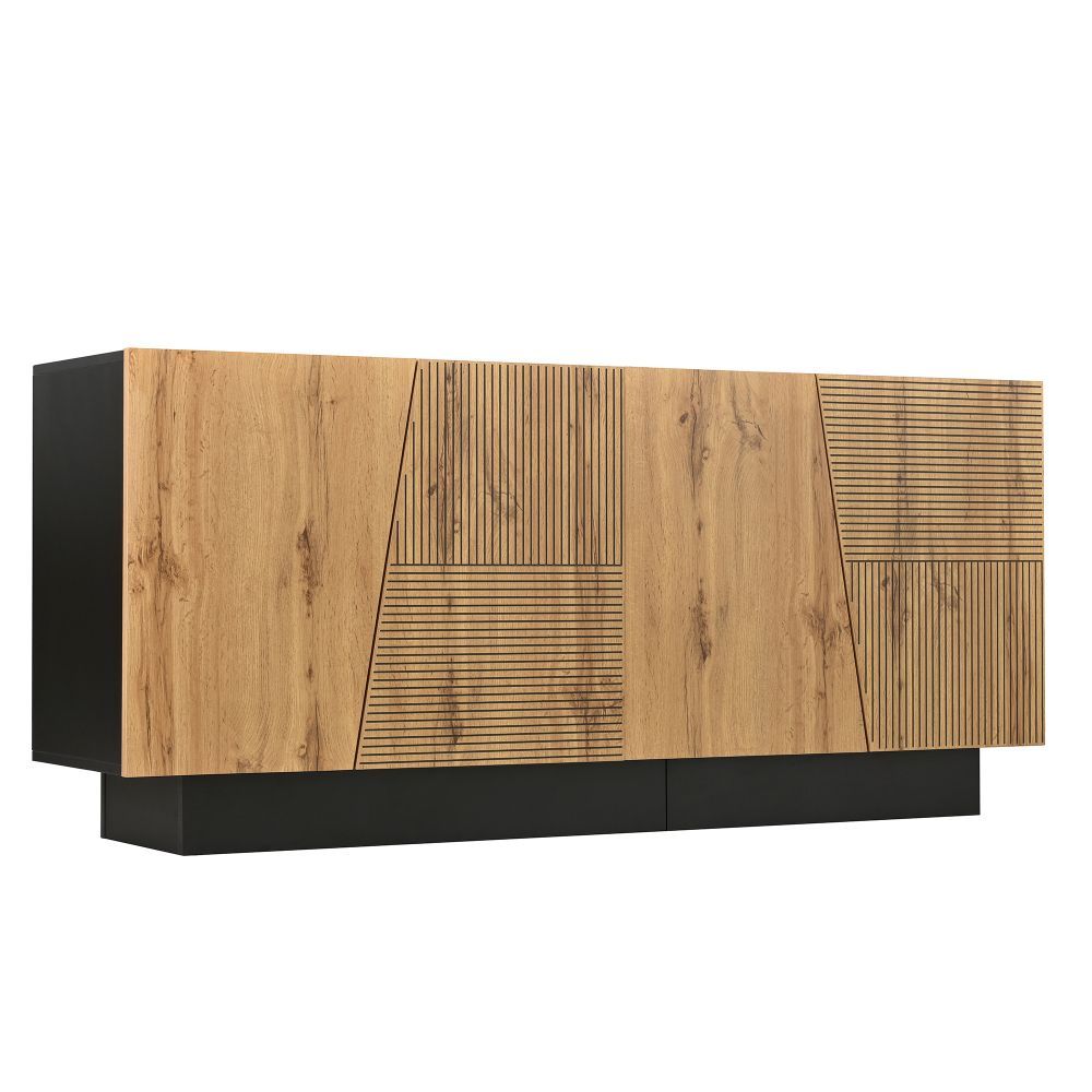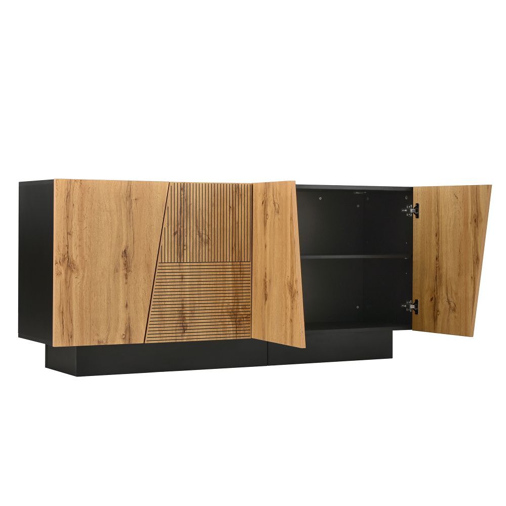 Modernes Sideboard mit großem Stauraum und geometrischem Design. Der verstellbare Einlegeboden ermöglicht flexible Aufbewahrung. Ideal für Wohnzimmer, Schlafzimmer oder Flur. Gefertigt aus robuster Spanplatte, praktisch und stilvoll für den Alltag.