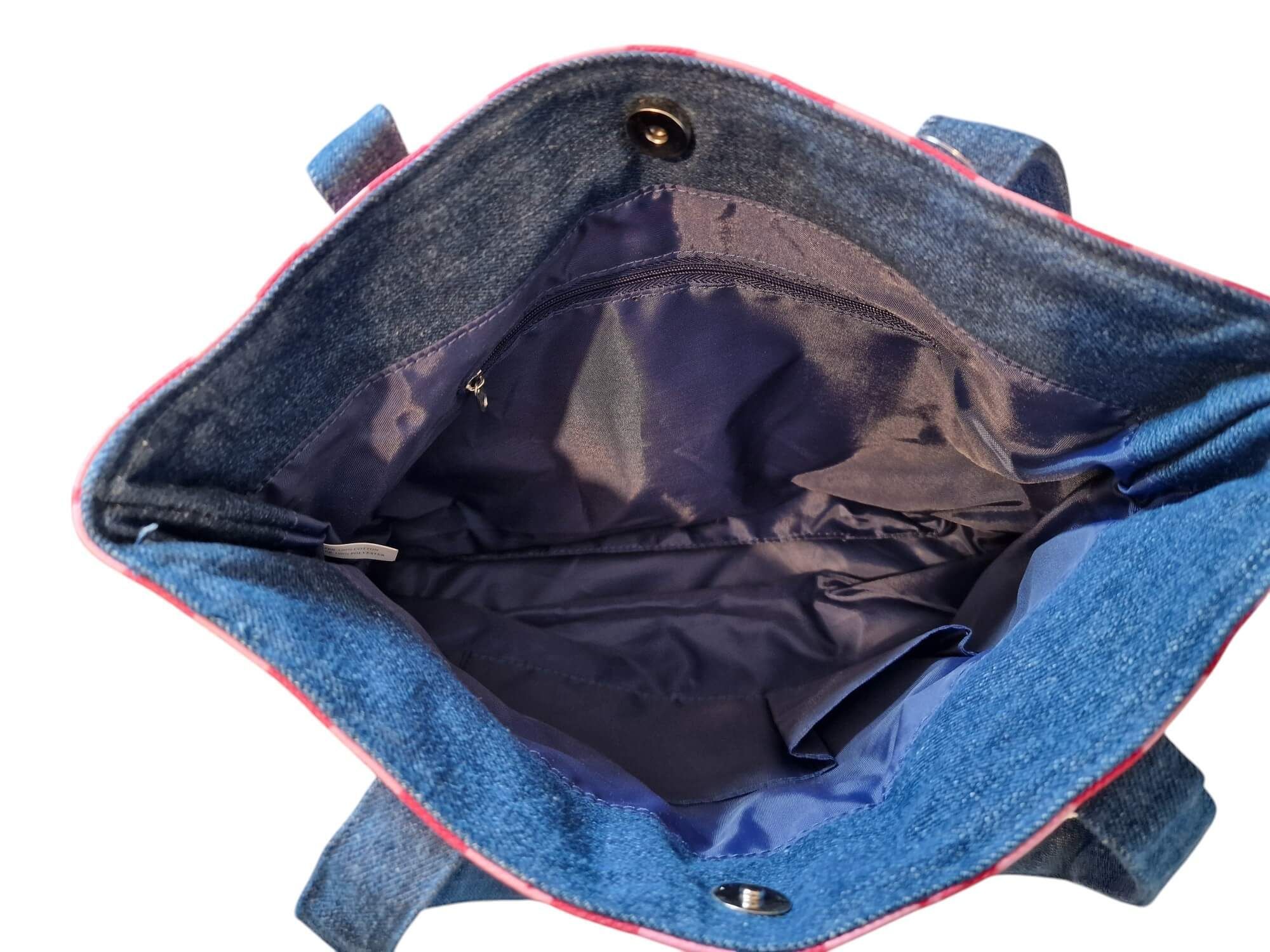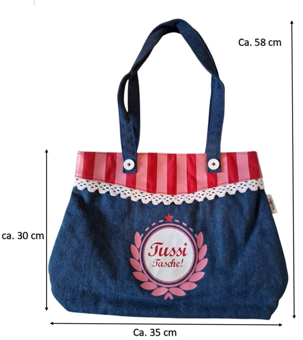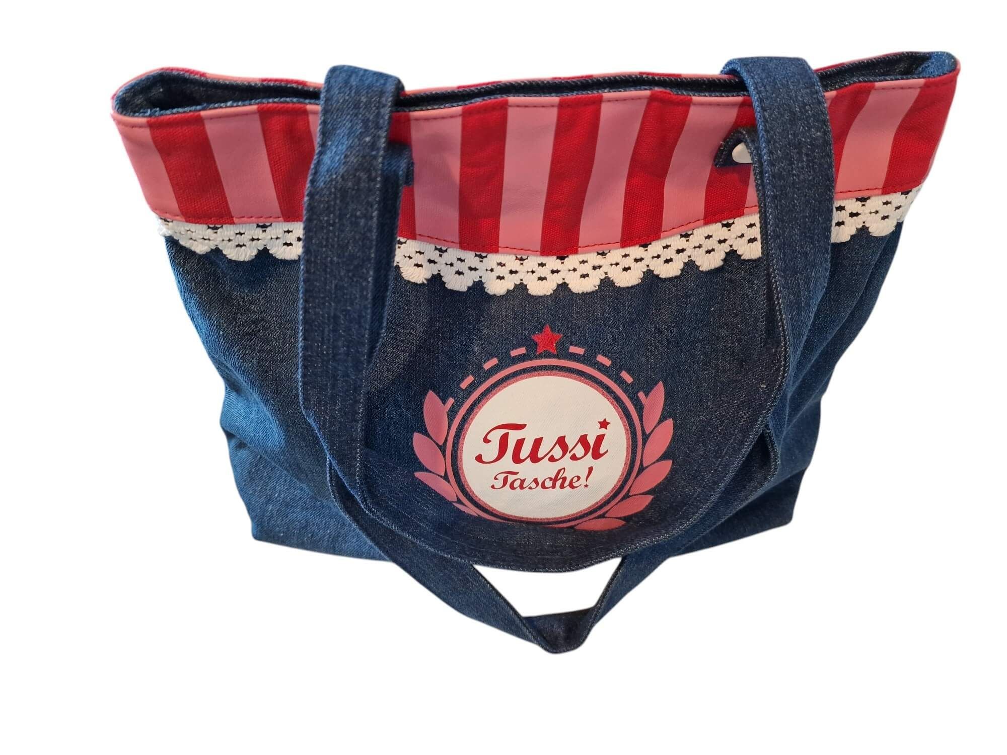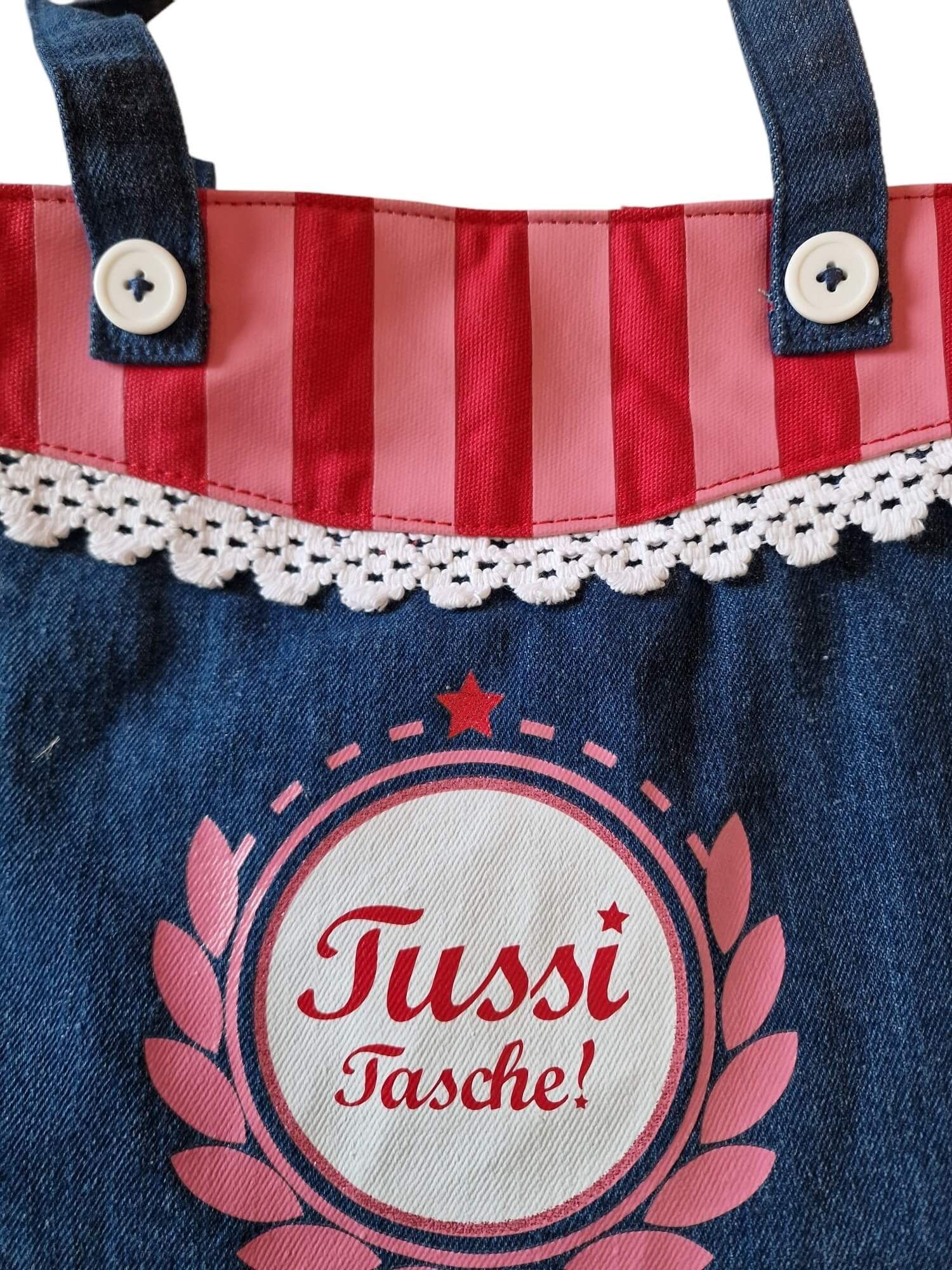 Modische "Tussi Tasche" aus blauer Baumwolle in Jeans Optik und pinken Akzenten