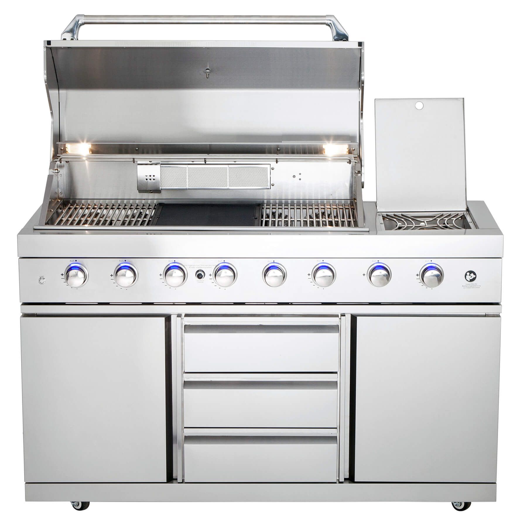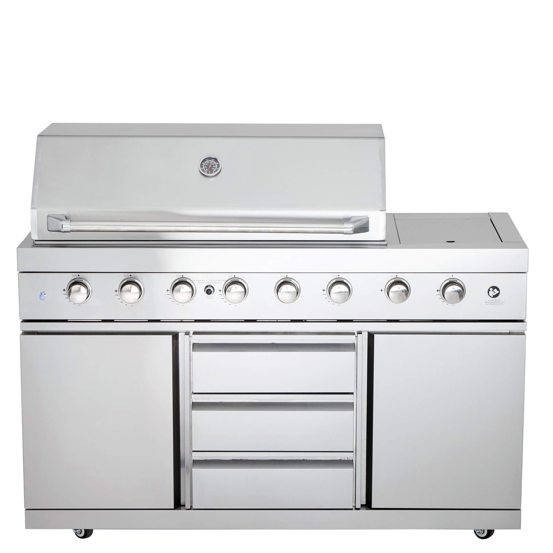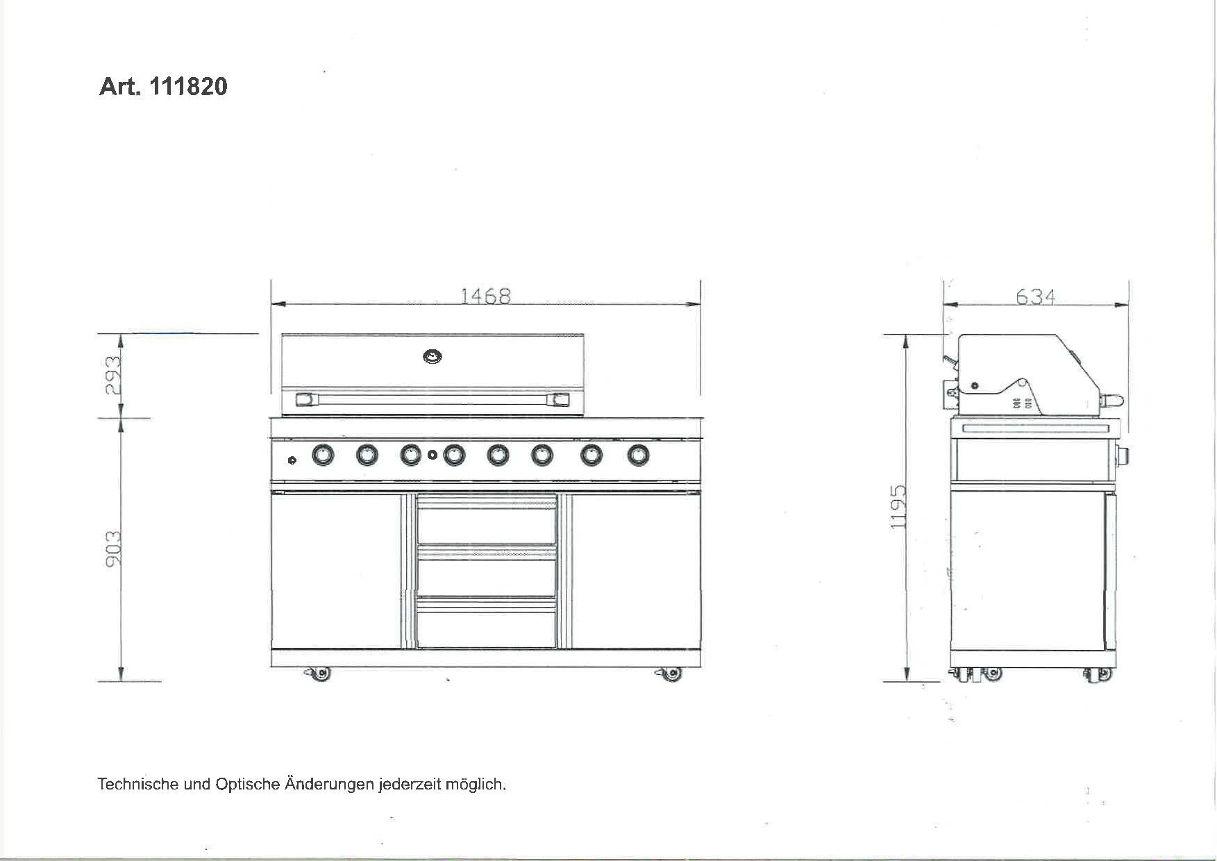 • Modul Grundgrill m. Seitenbrenner inkl. Airsystem (Edelstahl 304) • Gesamtleistung 27,7 kW, 6-flammig • Abmessung aufgebaut 147x65x119cm bei geöffneter Haube H 153cm; T 75cm • Grillfäche 96x46cm / 4.416cm² • 3-geteilter Edelstahlrost, Abmessung 2x 30x46cm; 1x 35x46cm • 6 Brenner mit je 3,5kW aus Edelstahl • Backburner mit 3,2kW • Seitenkocher mit 3,5 kW