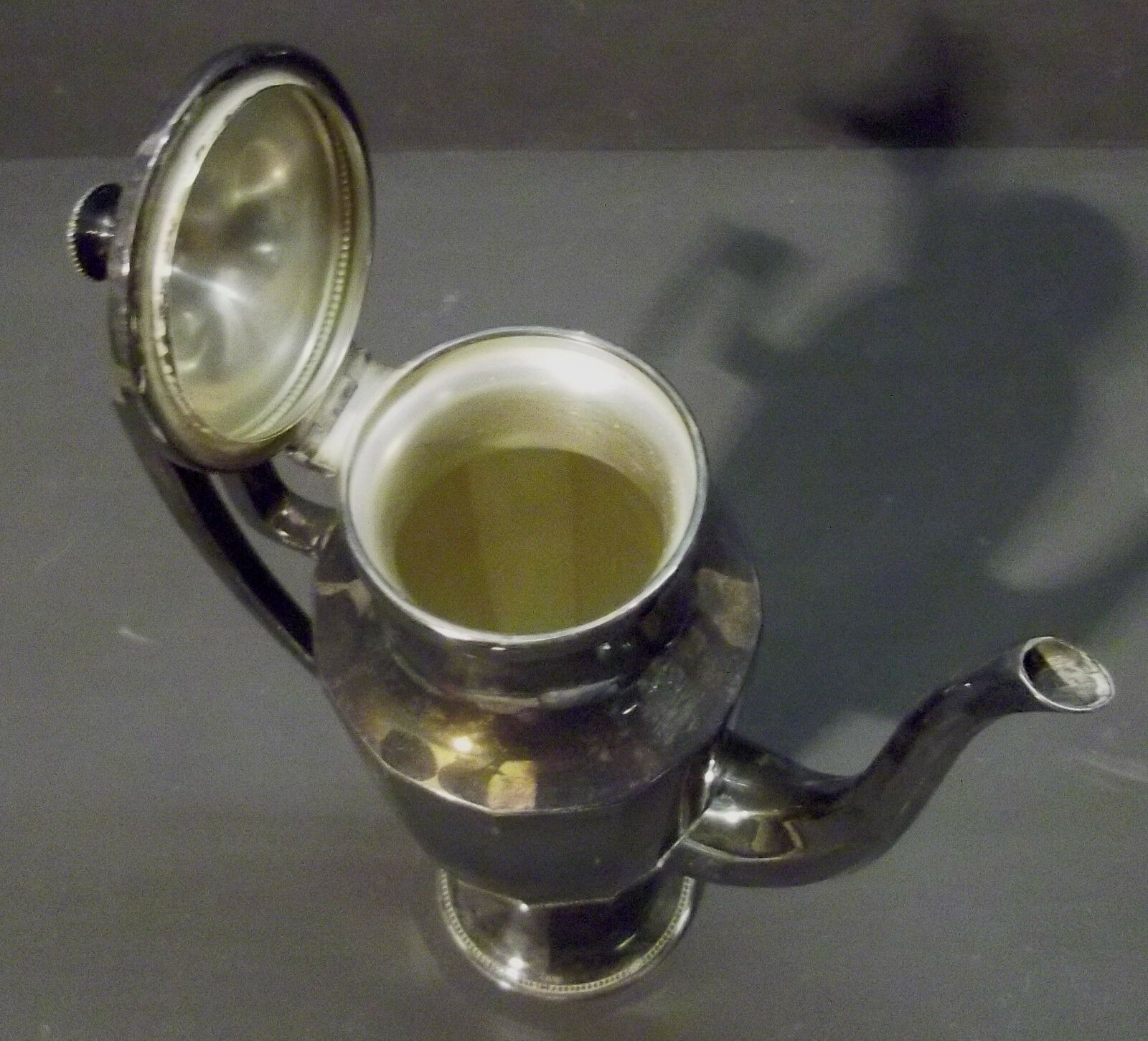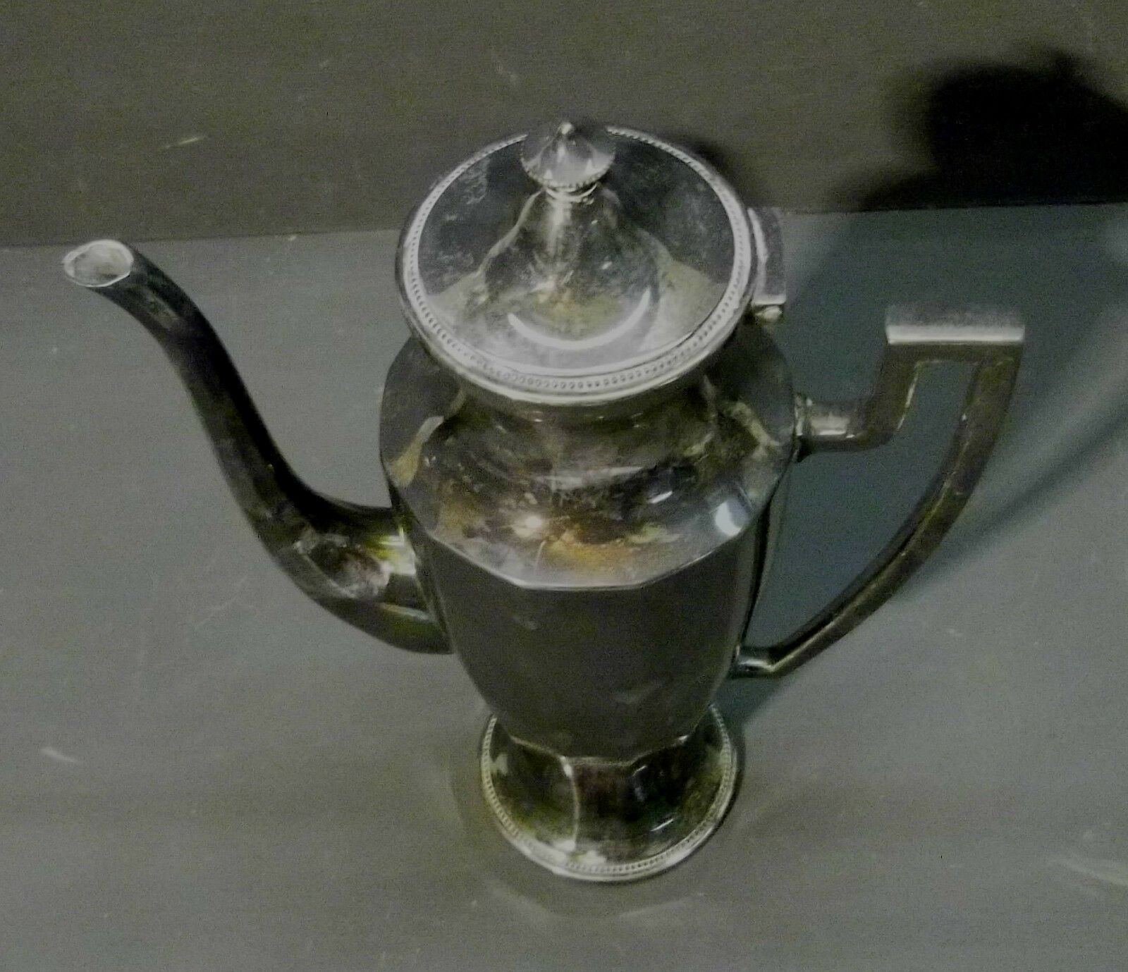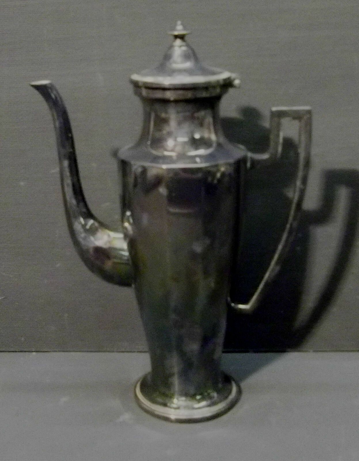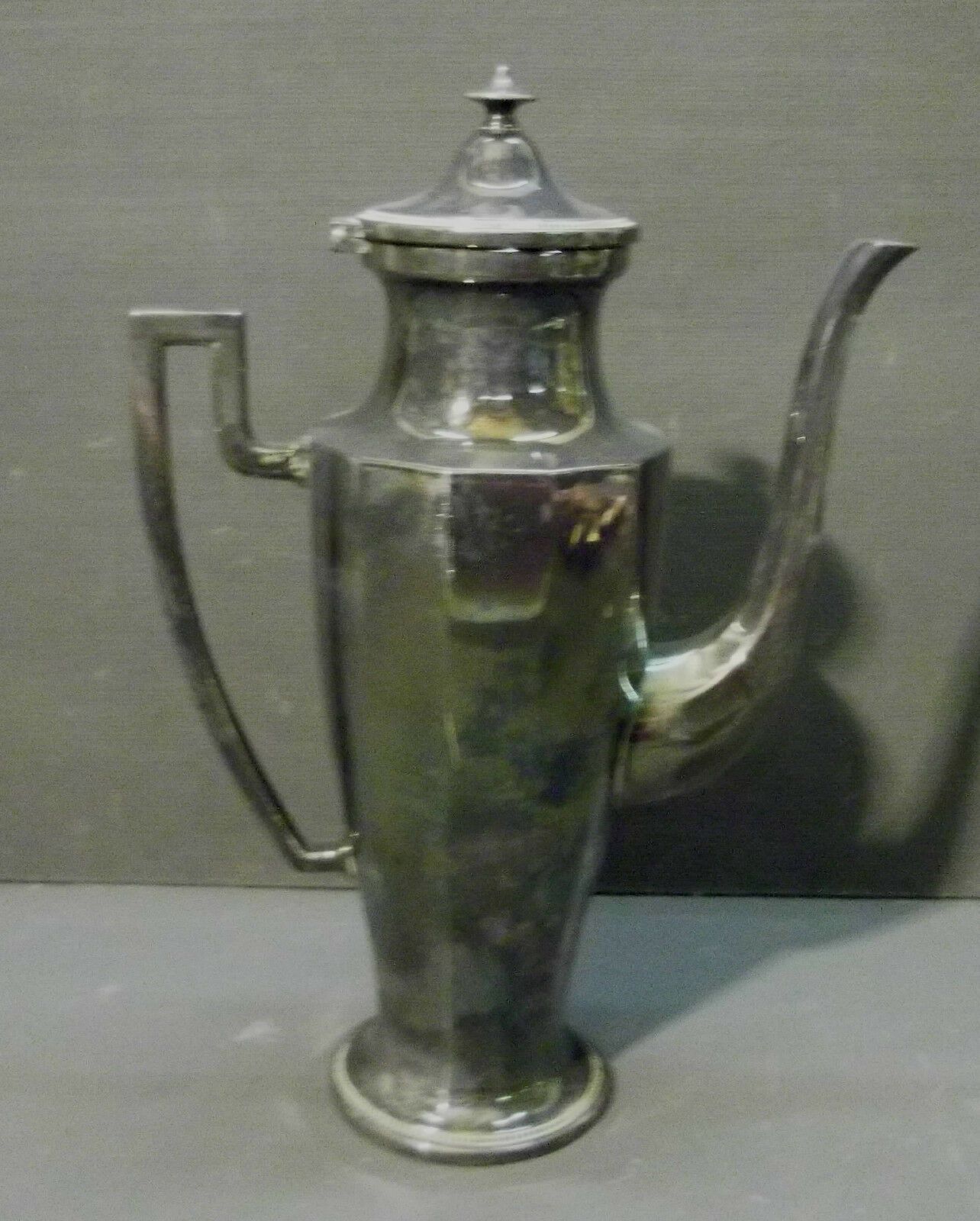Mokkakanne um 1900 (Jugendstil). Ohne Marke. Silver plated. Sehr gut erhalten, wohl nie benutzt - aber ungeputzt. Maße: H 23 cm. Antikes am Deich - Inh: Oliver Kipp-Trense USt.-ID-Nr: DE 118023451 Hersteller und oder Vertreiber von Verpackungen unterliegen den Verpflichtungen der Verpackungsverordnu