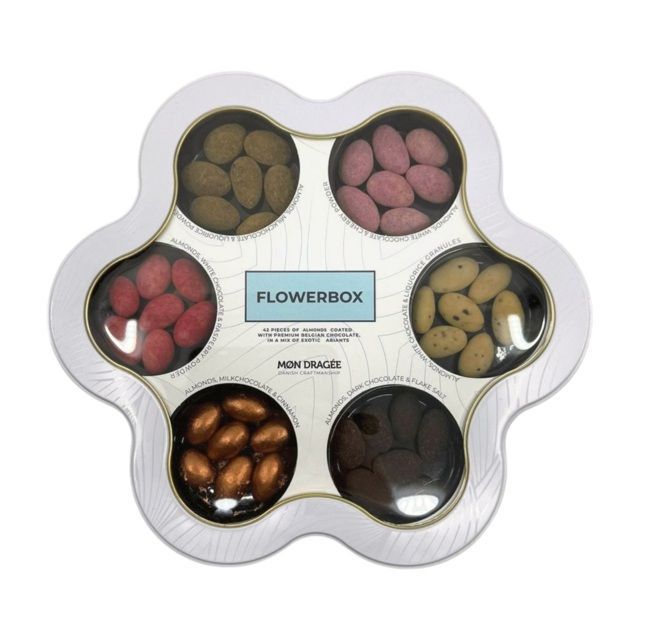 Mon Dragé Flower Box 180g Edle Pralinen-Geschenkbox 6 Sorten Schokomandeln