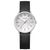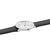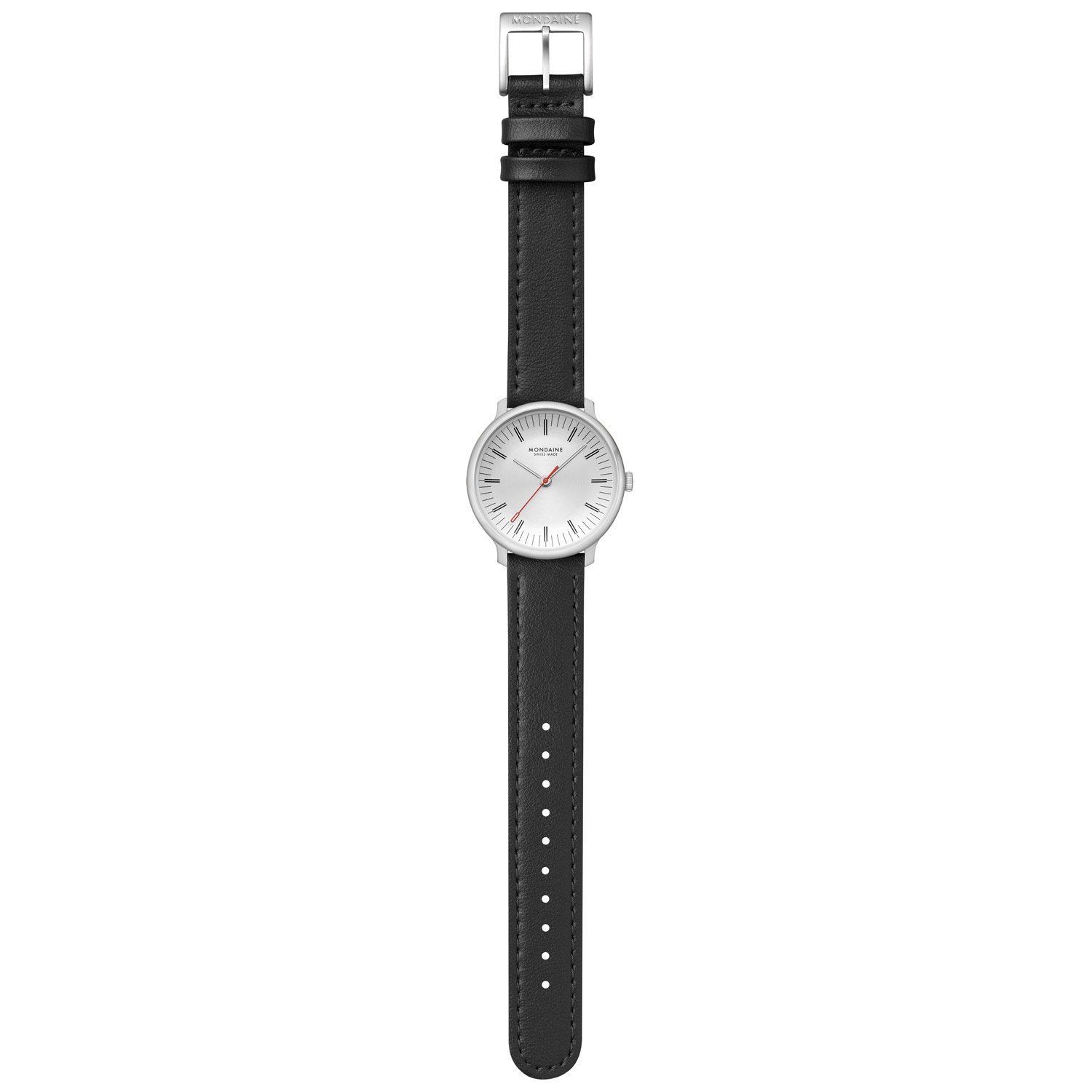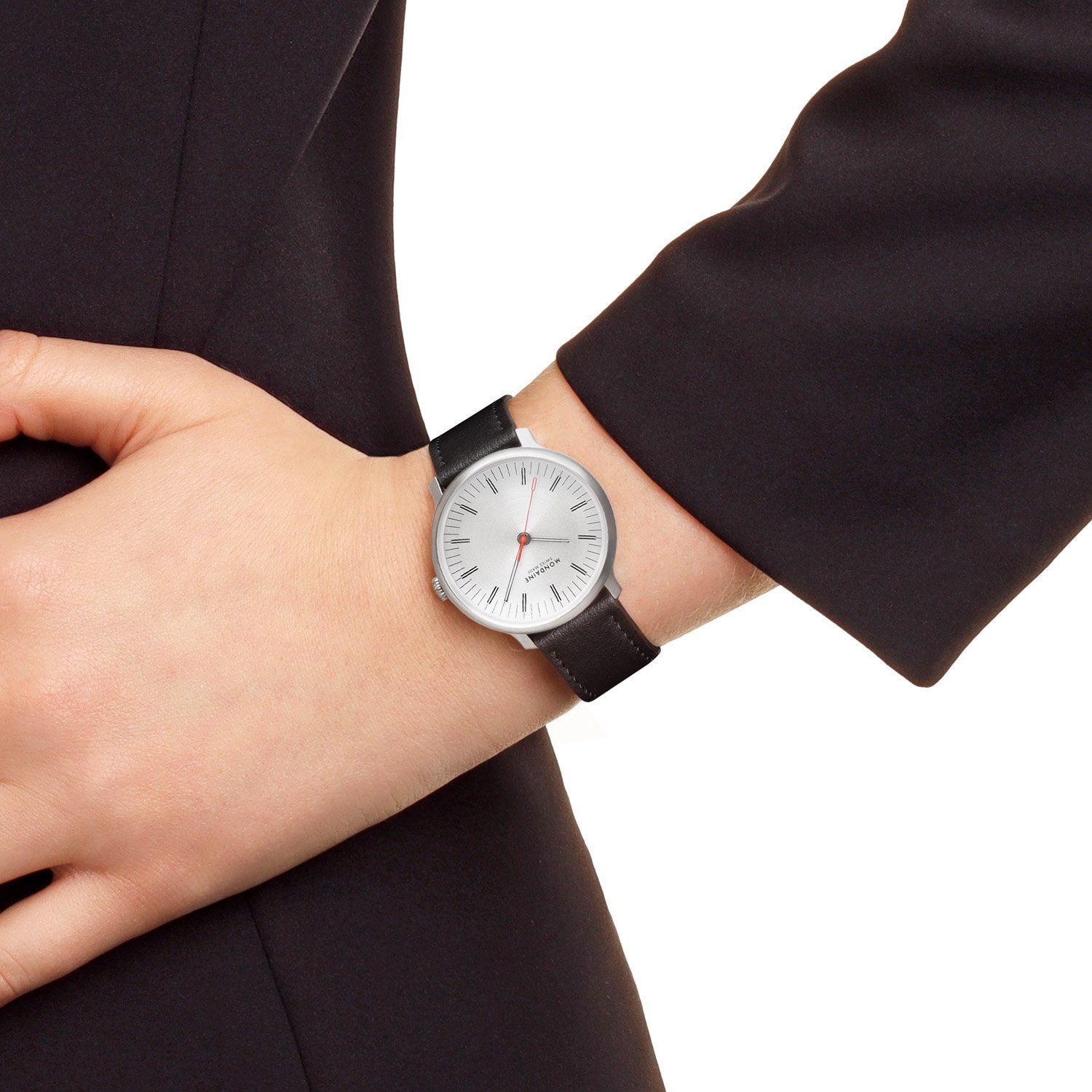 Swiss Made, schlichte Armbanduhr für Frauen, präzises Quarzwerk Ronda 763E, kreisförmig mattiertes, hellgraues Zifferblatt, konkav gewölbt, polierte Zeiger, dunkelgraue Zahlen und Indizes, zentraler roter Sekundenzeiger, poliertes Edelstahl-Gehäuse, Krone mit Logozeichen, kratzfestes Saphirglas mit Entspiegelungsbeschichtung, schwarzes veganes Armband aus organischen Nebenprodukten der Weinherstellung, polierte Dornschließe mit Logo, mit Schnellwechselsystem, wasserdicht bis 5 bar, Breite (ohne