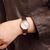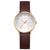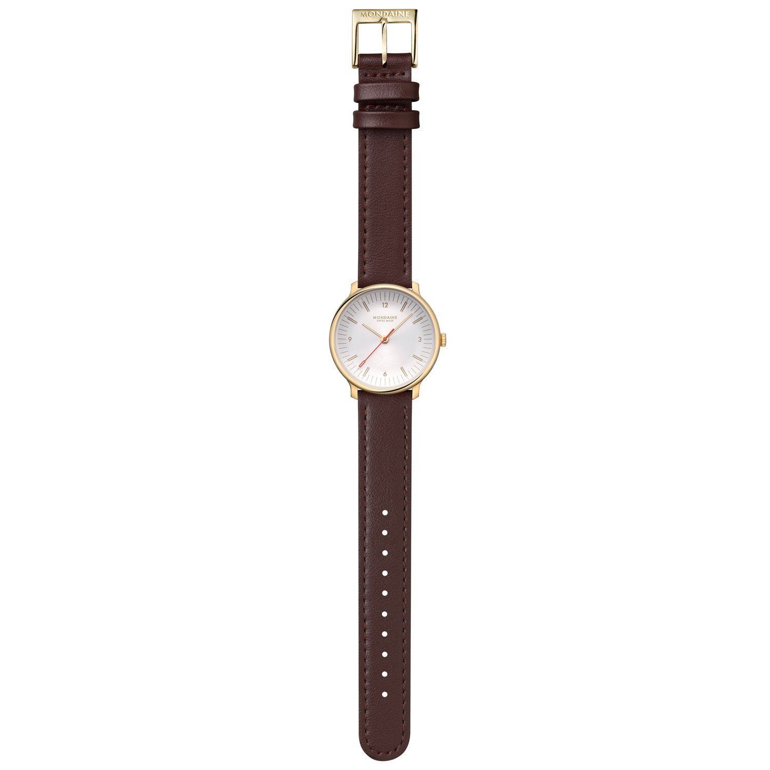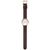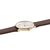 Swiss Made, zeitlose Armbanduhr für Frauen, präzises Quarzwerk Ronda 763E, kreisförmig mattiertes, hellgraues Zifferblatt, konkav gewölbt, goldfarbene Zeiger, Zahlen und Indizes, zentraler roter Sekundenzeiger, poliertes Edelstahl-Gehäuse, gold ionen-plattiert, Krone mit Logozeichen, kratzfestes Saphirglas mit Entspiegelungsbeschichtung, braunes veganes Armband aus organischen Nebenprodukten der Weinherstellung, polierte Dornschließe mit Logo, mit Schnellwechselsystem, wasserdicht bis 5 bar, Bre