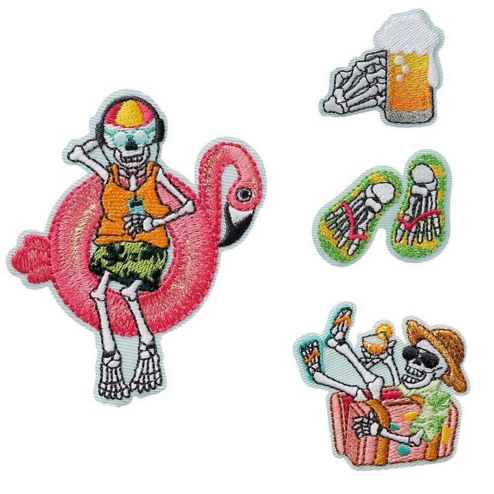 Bügelbild - zum schnellen Ausbessern und Aufpeppen von Textilien. Aufnähen oder aufbügeln. (1 Stück) Maße : Flip Flops ca. 3,6 x 3,4 cm Bier ca. 3,3 x 3,5 cm mit Flamingo ca. 6,5 x 5,5 cm im Koffer ca. 4,3 x 4,5 cm Material : 65% Polyester 35% Nylon Anleitung ist hinten auf der Verpackung aufgedruck