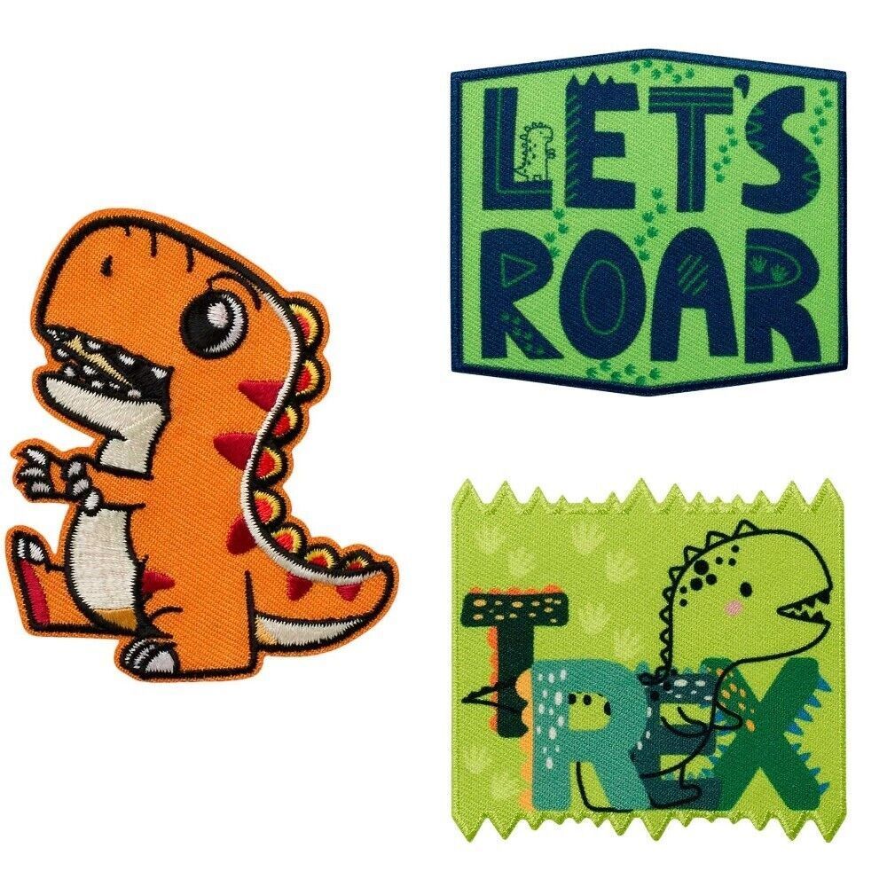 Bügelbild - zum schnellen Ausbessern und Aufpeppen von Textilien. Aufnähen oder aufbügeln. (1 Stück) Maße: T-Rex ca. 6,5 x 7 cm ROAR ca. 6,2 x 7,1 cm Dino ca. 7,2 x 6 cm Material: 100%Polyester Anleitung ist hinten auf der Verpackung aufgedruckt! Bei empfindlichen Stoffen aufnähen. Einleger aus 100%