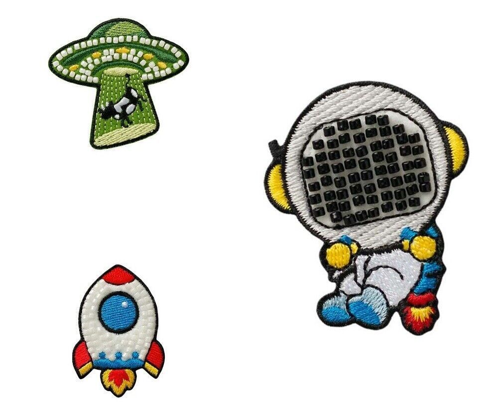 Bügelbild - zum schnellen Ausbessern und Aufpeppen von Textilien. Aufnähen oder aufbügeln. (1 Stück) Maße : Astronaut ca. 4,5 x 3,6 cm Rakete ca. 4,5 x 3,2 cm UFO ca. 4,3 x 4,7 cm Material : 59% Polyester 41% Nylon Anleitung ist hinten auf der Verpackung aufgedruckt! Bei empfindlichen Stoffen aufnäh