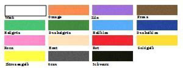 Weiss, Schwarz, Zitronengelb, Goldgelb, Rot, Haut, Hellblau, Dunkelblau, Hellgruen, Braun, Lila, Orange und Violett