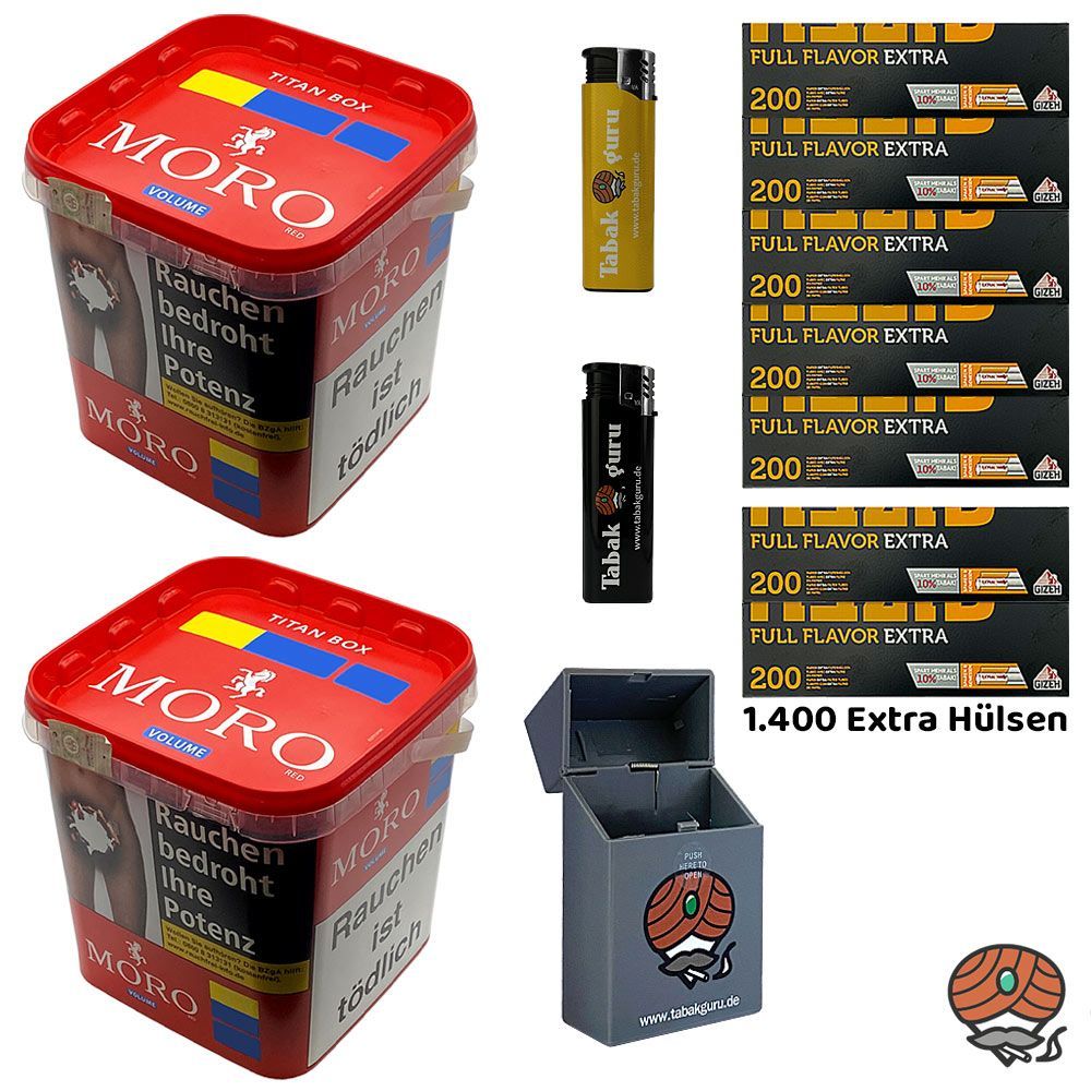 2 x Moro Red Rot Volumentabak Titan Box + 1.400 Gizeh Full Flavor Extra Filterhülsen + 2 Sturmfeuerzeuge (nicht wählbar) + 1 Zigarettenbox (nicht wählbar) Tabak: Moro Red Volumen ist eine leicht zu stopfende Tabakmischung, deren sorgfältig ausgewählte Virginia- und Burley-Tabake der Mischung ihren v