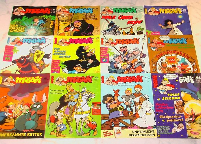 12 Mosaikhefte mit den Abrafaxen, Heft-Nummern 193 bis 204, kompletter Jahrgang 1992, Zustand: Verlagsneu, ungelesen, ohne den kleinsten Makel, am Kiosk gekauft und in einer Schutzhülle unter Lichtverschluß aufbewahrt wie einen Schatz, versicherter Versand via DHL-Postpaket für 4,99 €, optimale
