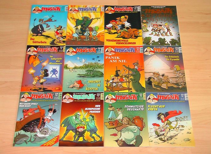 12 Mosaikhefte mit den Abrafaxen, Heft-Nummern 229 bis 240, kompletter Jahrgang 1995, Zustand: Verlagsneu, ungelesen, ohne den kleinsten Makel, am Kiosk gekauft und in einer Schutzhülle unter Lichtverschluß aufbewahrt wie einen Schatz, versicherter Versand via DHL-Postpaket für 4,99 €, optimale