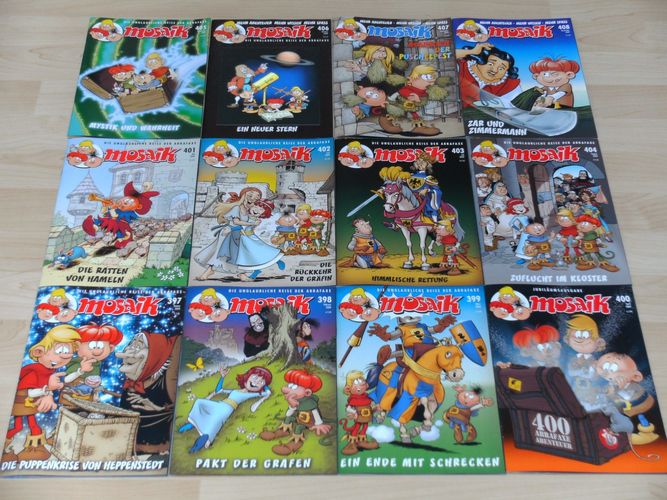 12 Mosaikhefte mit den Abrafaxen, Heft-Nummern 397 bis 408, kompletter Jahrgang 2009, Zustand: Verlagsneu, ungelesen, ohne den kleinsten Makel, am Kiosk gekauft und in einer Schutzhülle unter Lichtverschluß aufbewahrt wie einen Schatz, versicherter Versand via DHL-Postpaket für 4,99 €, optimale
