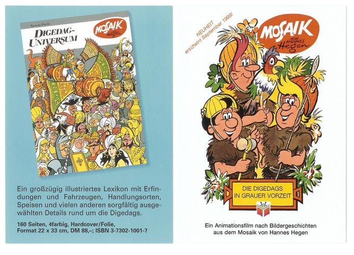 Inhalt meines Angebotes sind die 2 Sonderbeilagen aus den Mosaik-Reprintmappen 6 ( Digedag-Universum ) und 8 ( In grauer Vorzeit ) von Hannes Hegen. Limitierte Auflagen, begehrte Sammlerobjekte, eine absolute Seltenheit. Erschienen in den Jahren 1997 und 1999 beim Buchverlag Junge Welt. Größe = jewe