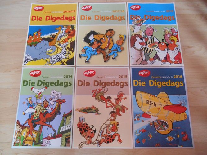 6 Mosaik-Kataloge Gesamtverzeichnisse von 2014, 2015, 2016, 2017, 2018 und 2019 zur Digedag-Serie. Die MOSAIK-Kataloge beinhalten alle aktuellen Mosaikartikel des Buchverlages Junge Welt, unter anderem alle zur Zeit verfügbaren Buchbände zu den Serien Wie alles begann! , Römer-Serie , Weltraum-Serie