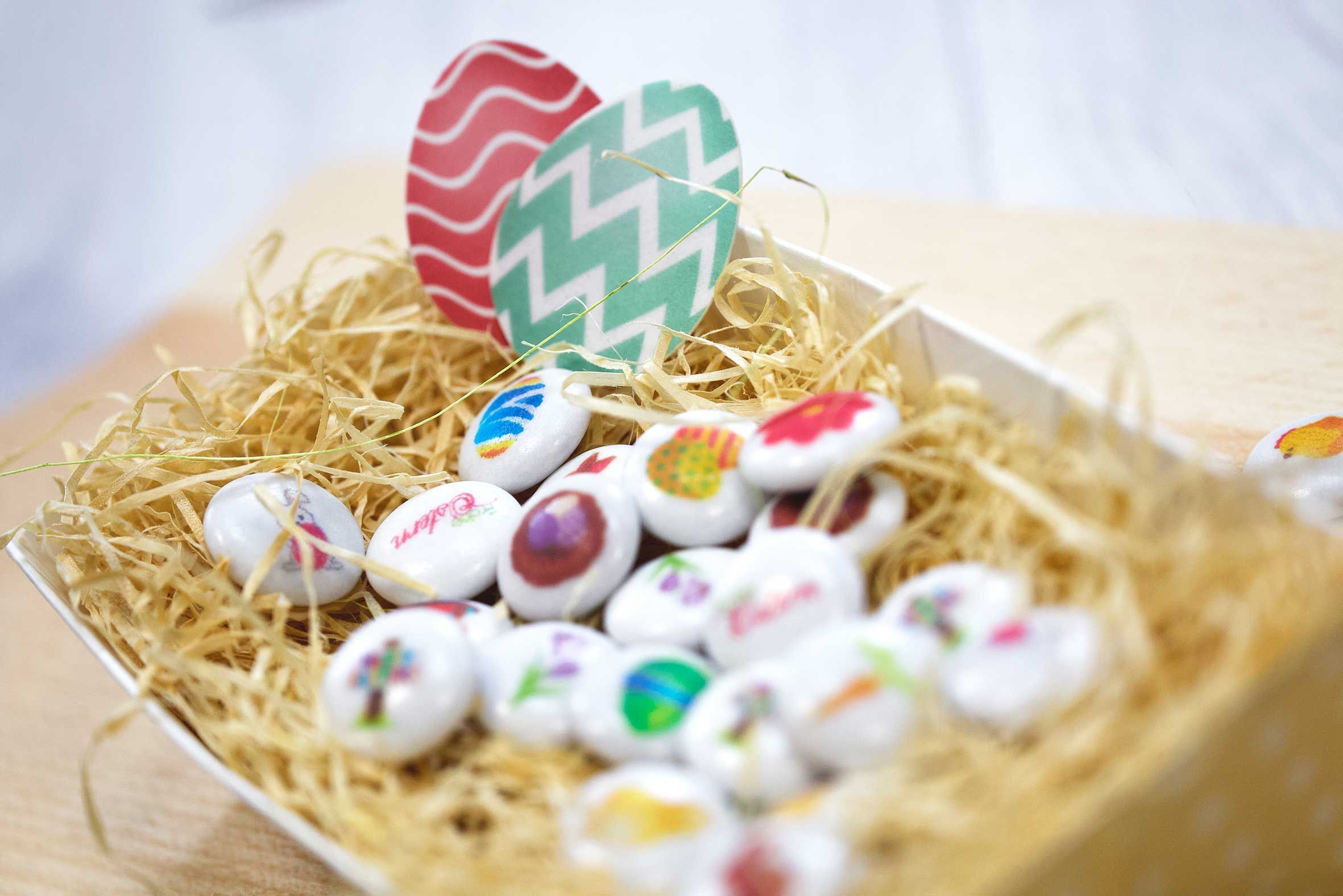 Passende essbare Osterdeko die schmeckt. Unsere bedruckten Schokolinsen mit Ostermotiven eignen sich hierfür super. Ab sofort im Shop!