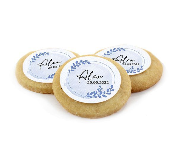 MotivCookies `Alex´ Blau mit Namen und Datum Motivkekse in blauem Design mit Ranke, bedruckt mit Namen und Datum für Taufe, Kommunion, Jugendweihe oder Geburt. Als Gastgeschenk für Ihre Feier eine tolle Möglichkeit Danke zu sagen! Ein leckerer Mürbteigkeks, verfeinert mit feinen Aromen. Druckfläche