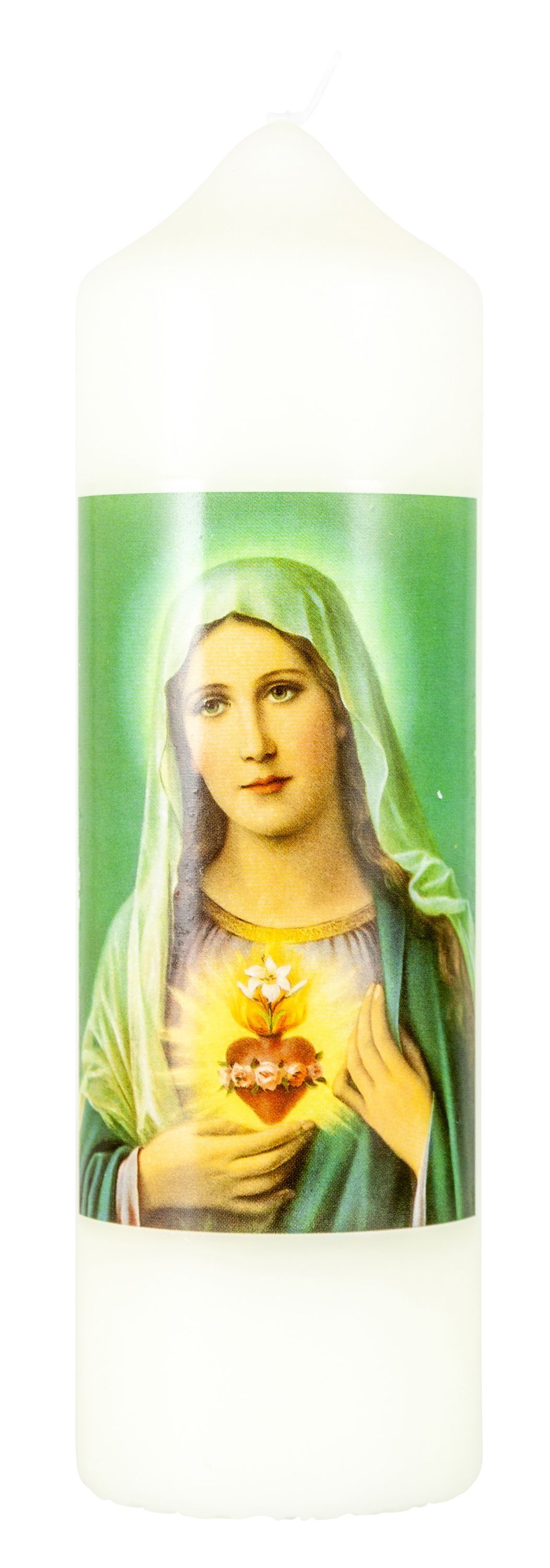 schön gestaltete Motivkerze mit Druckmotiv Herz Maria. Details zum Produkt: Größe: 16,5 x 5cm Material: Wachs