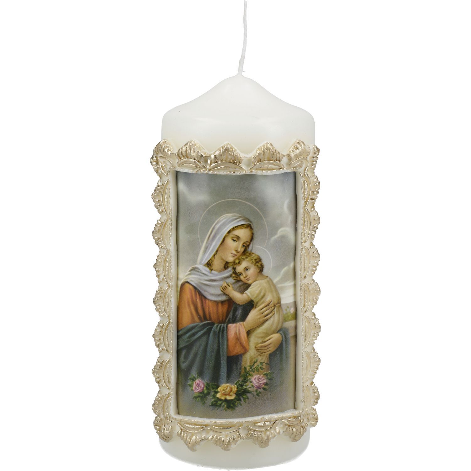 schön gestaltete Motivkerze mit Bildmotiv Mutter Gottes, mit goldenen barockem Rahmen. Details zum Produkt: Größe: 16 x 6cm