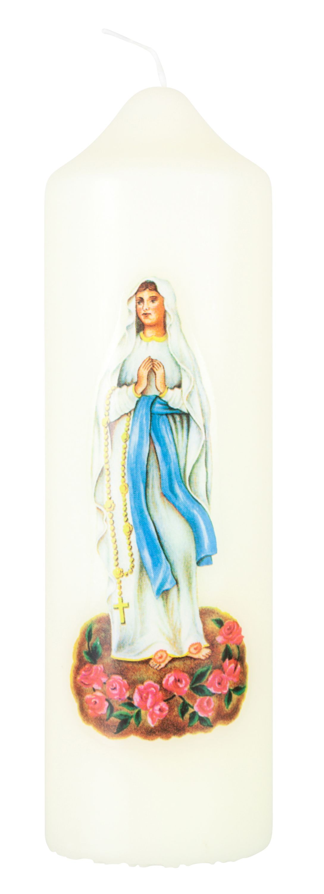 schön gestaltete Motivkerze mit Druckmotiv Lourdes Madonna. Details zum Produkt: Größe: 16,5 x 5cm Material: Wachs