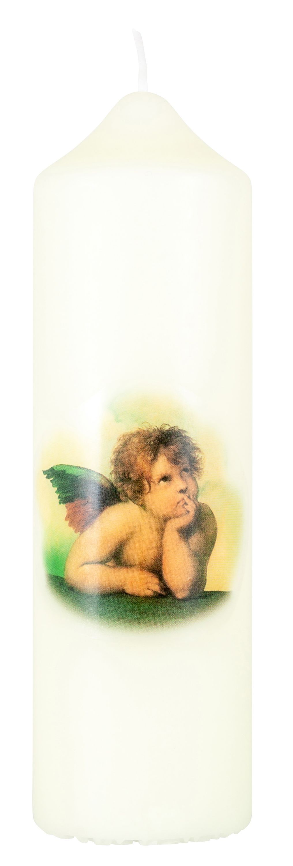 schön gestaltete Motivkerze mit Druckmotiv Raffael Engel. Details zum Produkt: Größe: 16,5 x 5cm Material: Wachs